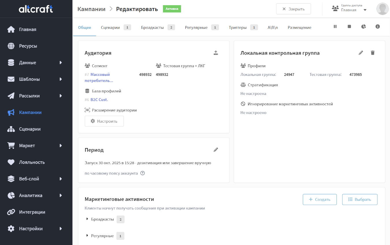 Within a campaign, you can configure audiences, segment databases, manage user profiles, control groups, and scenarios. Campaigns support both creating new and adding existing marketing activities: scenarios, broadcasts, recurring, trigger-based, multivariate, and placements.