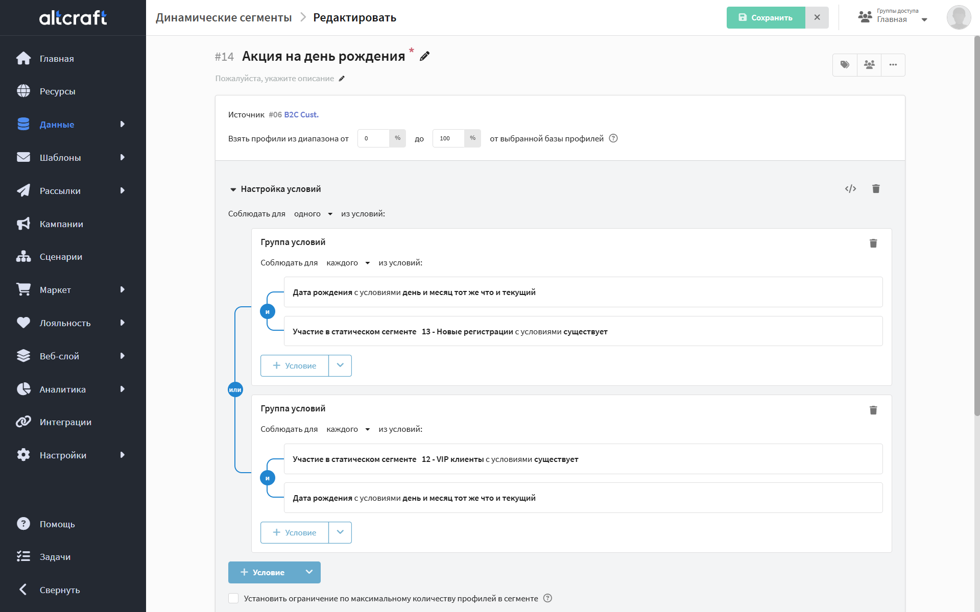 - Dynamic segment — a set of conditions rather than a stored profile list. It is calculated before each use and can display selection results without saving the segment.