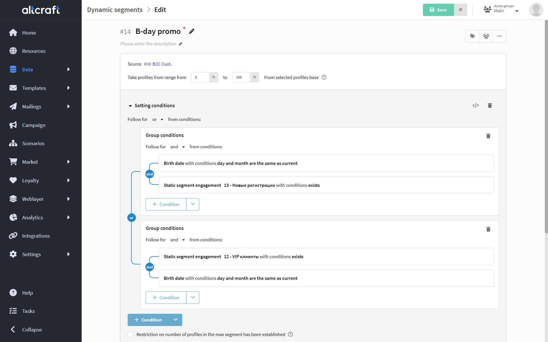 - Dynamic segment — essentially a set of conditions rather than a list of profiles. The segment is recalculated on each use and can display selection results without saving the segment.