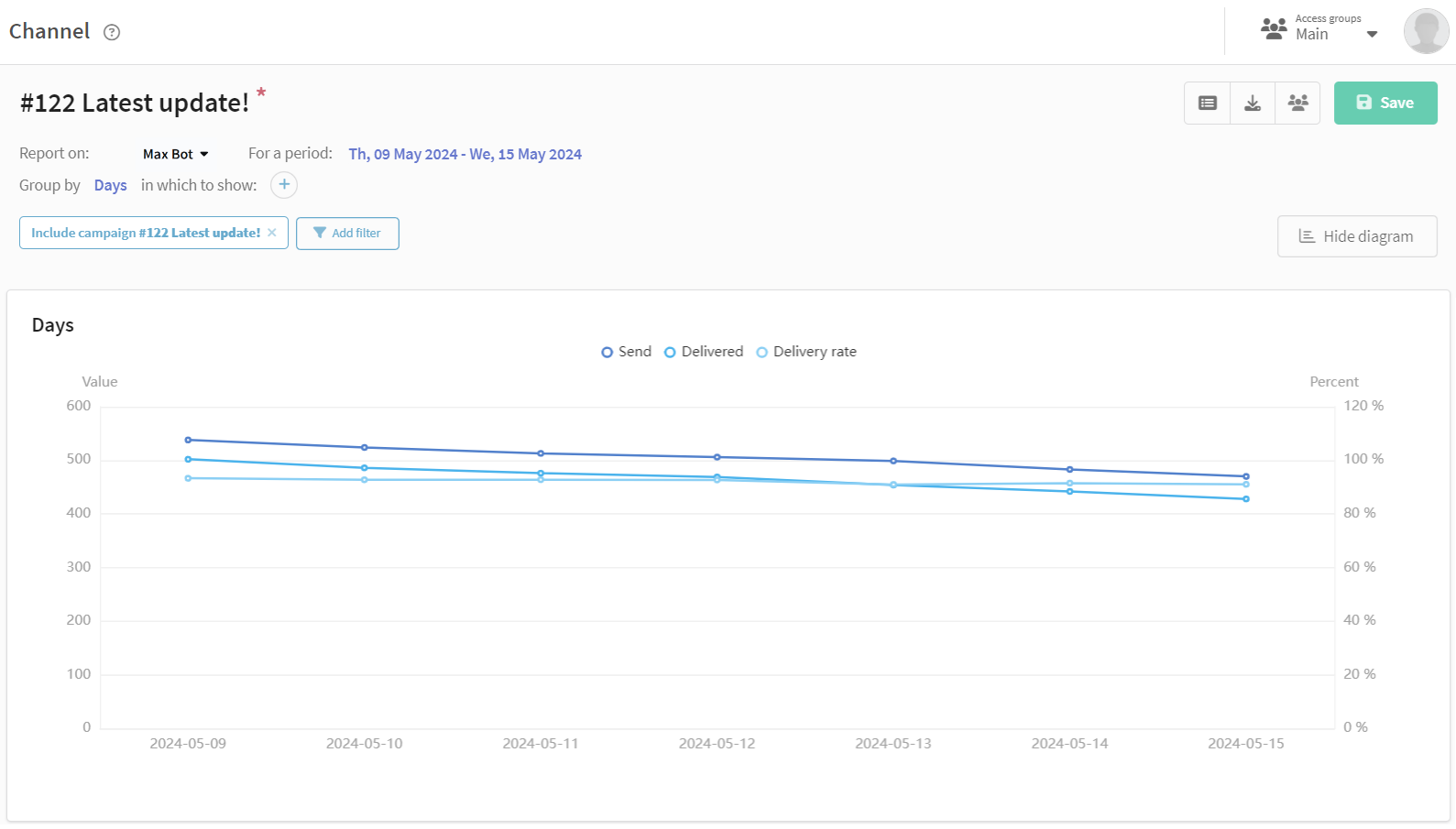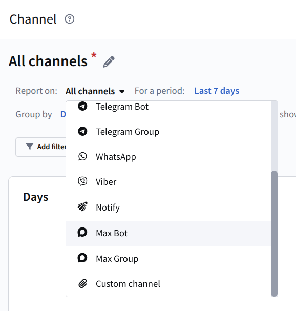 To access statistics, open the Analytics section in the main platform menu. By default, the report for All channels for the last 7 days is displayed.