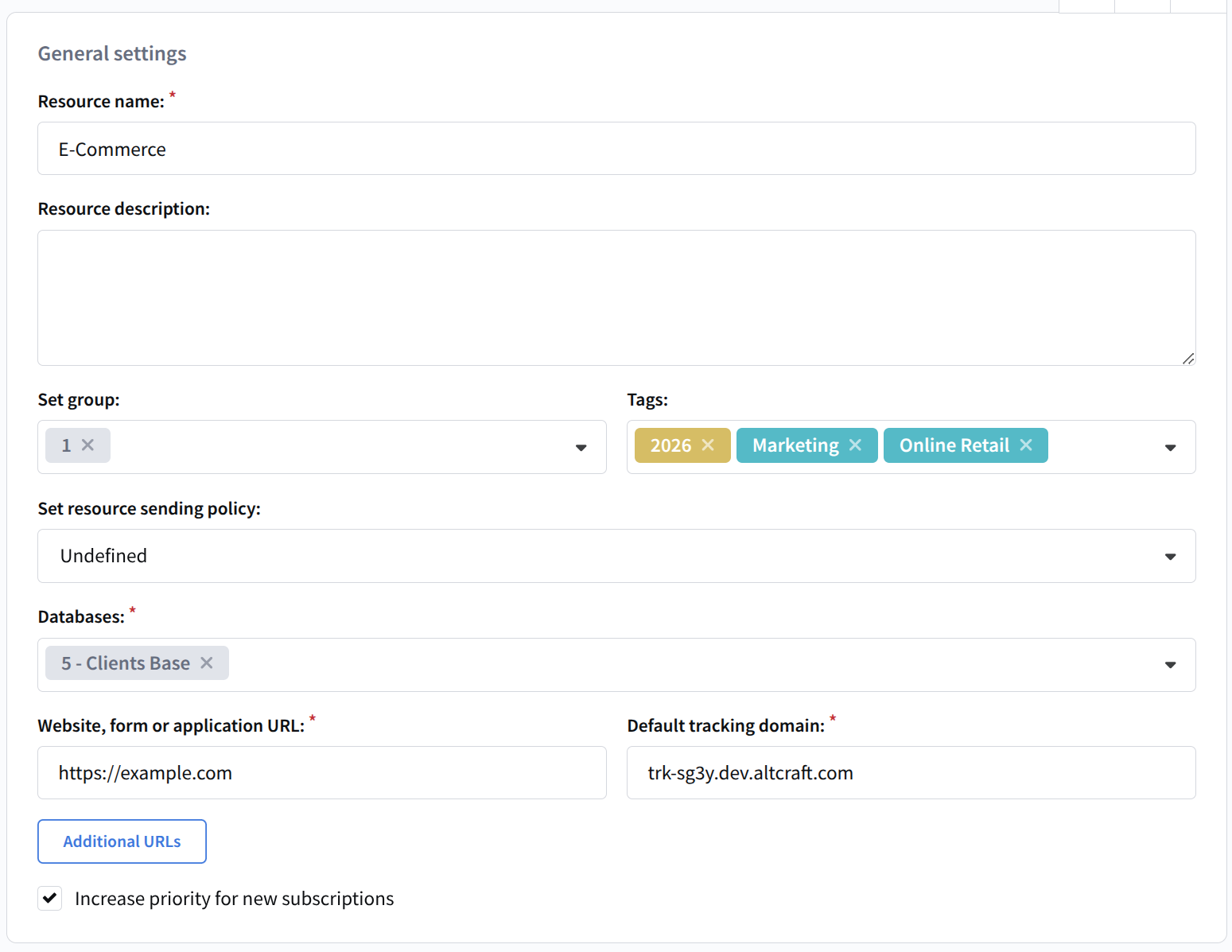 In the main settings, add the required databases. Specify the default tracking domain that will process subscriber clicks on links in MAX bot messages: