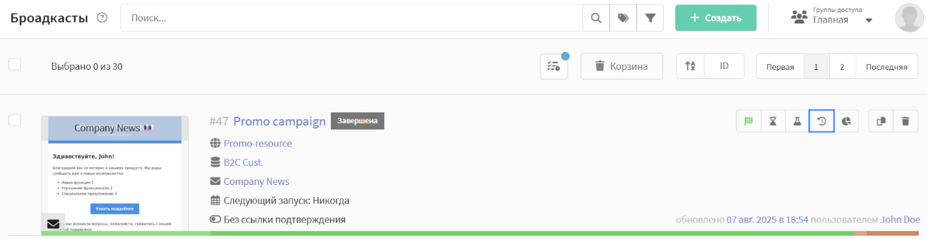 After completing the Mailing configuration, save it. It will appear in the list of Mailings of the corresponding type. On the right side of each record there is a quick actions menu. From there you can perform a test send