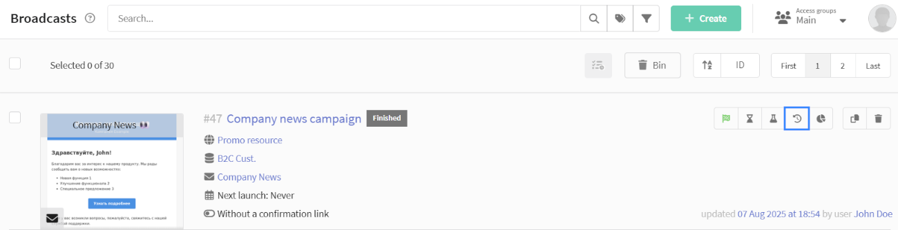 When the campaign is fully configured, save it. It will be displayed in the list of campaigns of the corresponding type. There is a quick action menu on the right side of each entry. By its means, you can send test message and, if everything is good, activate your actual campaign :