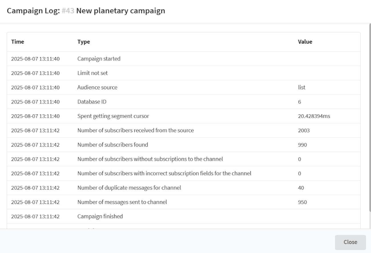 The Campaign Log is a tool that provides a summary of the progress of your email campaign. It logs key events, campaign parameters, and statistics, helping you identify potential issues.
