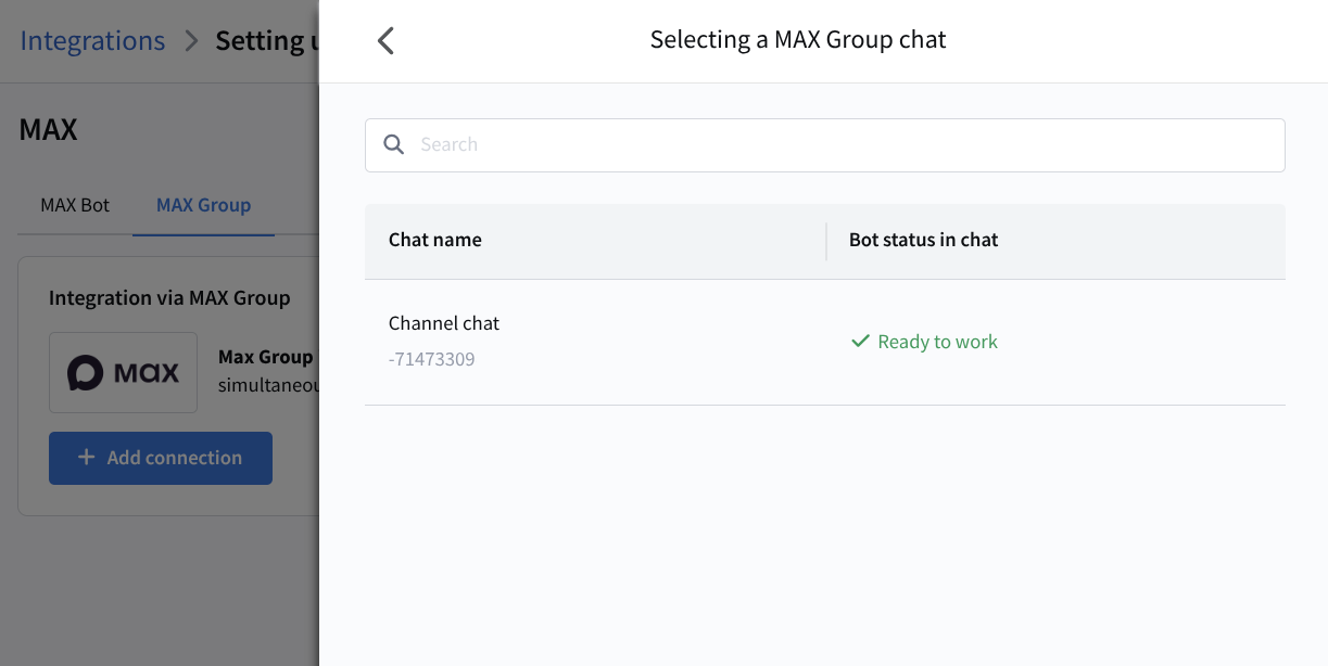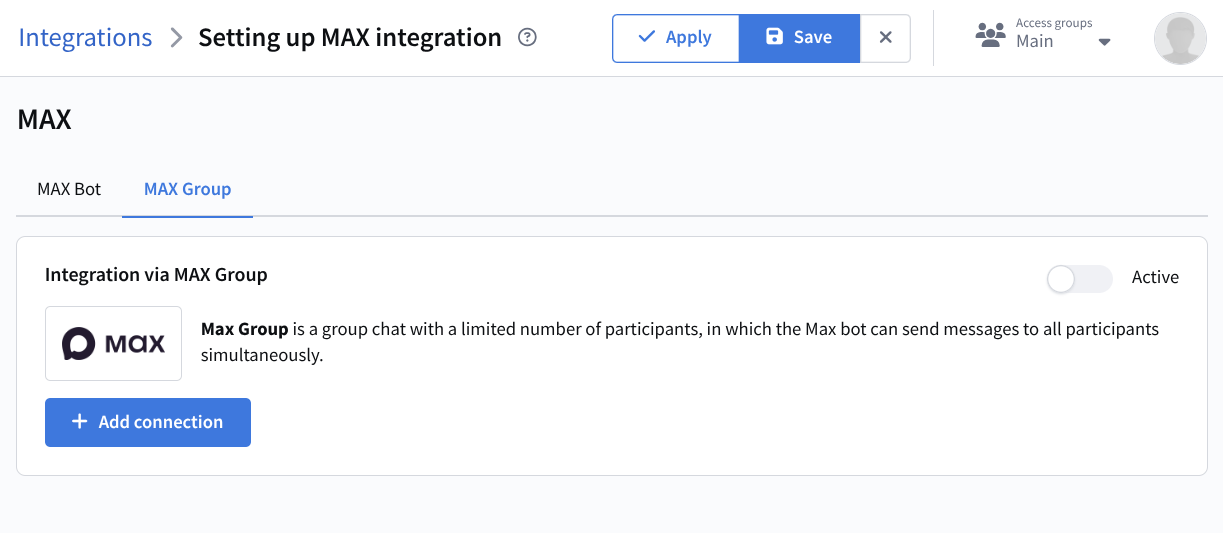 To create an integration, you must first configure a connection to the service. Instructions for connecting a MAX bot are available on this page.