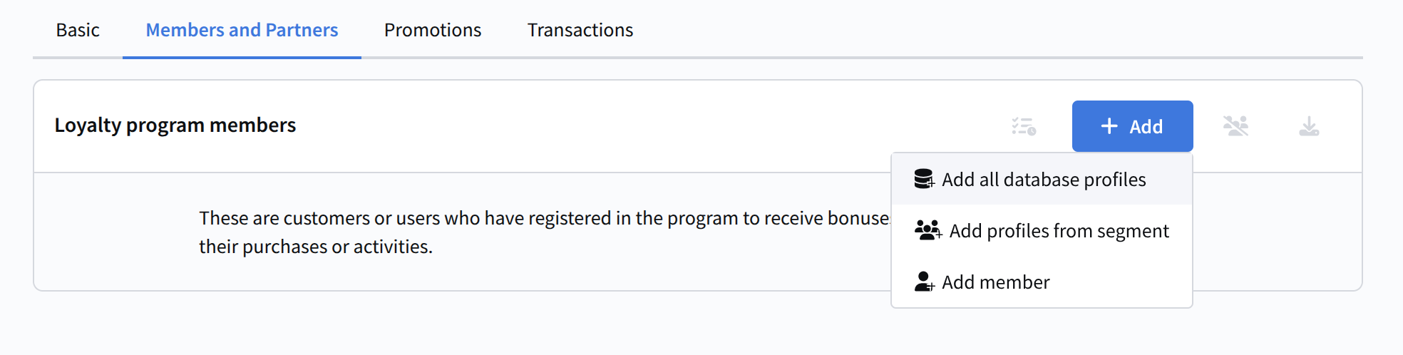 1. Add all database profiles — mass registration of all customers in the database. 2. Add profiles from a segment — registration of a selected group of users, for example, active customers, those who recently paid for a service, etc. 3. Add a member — manual registration of a single customer.