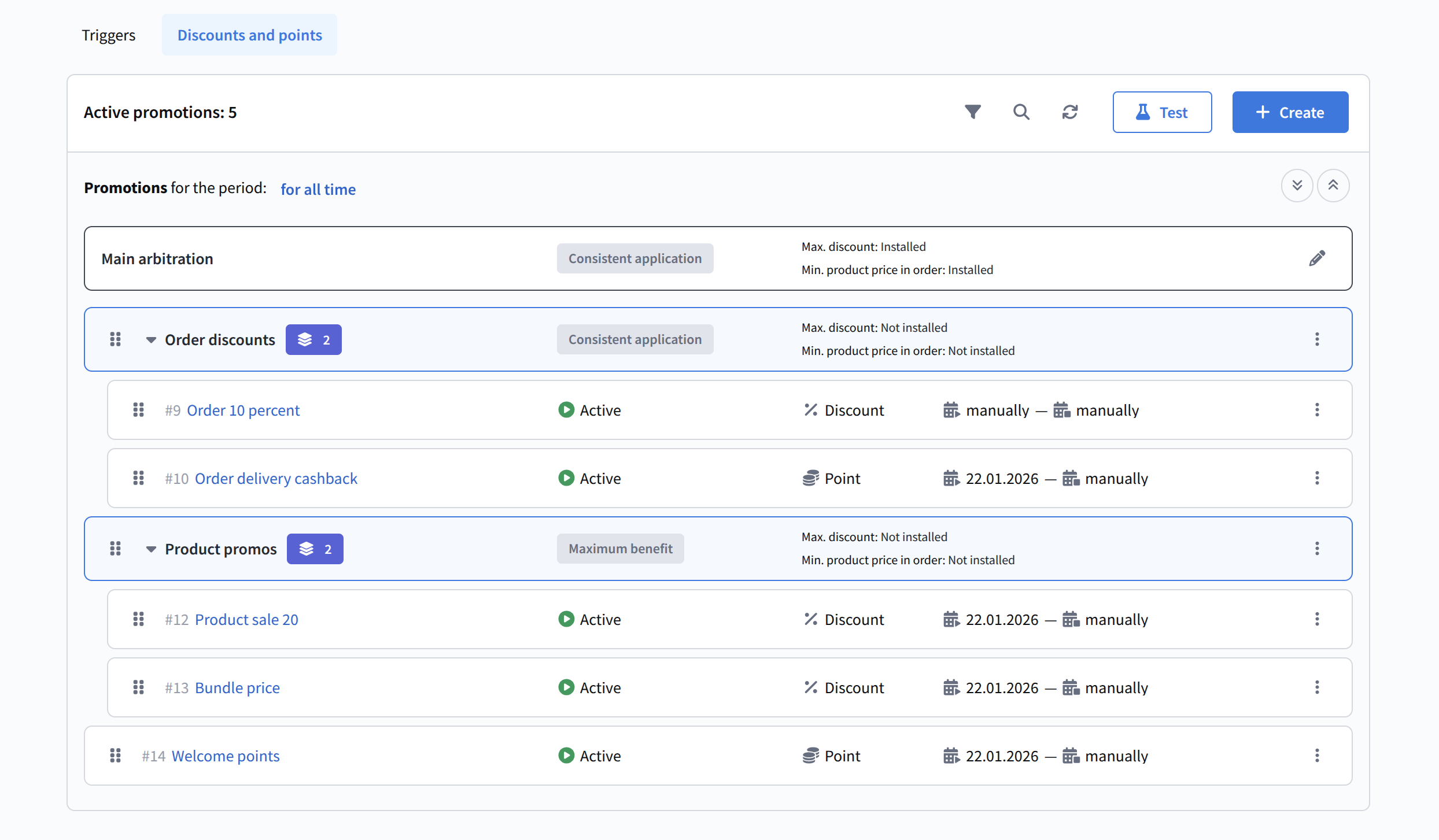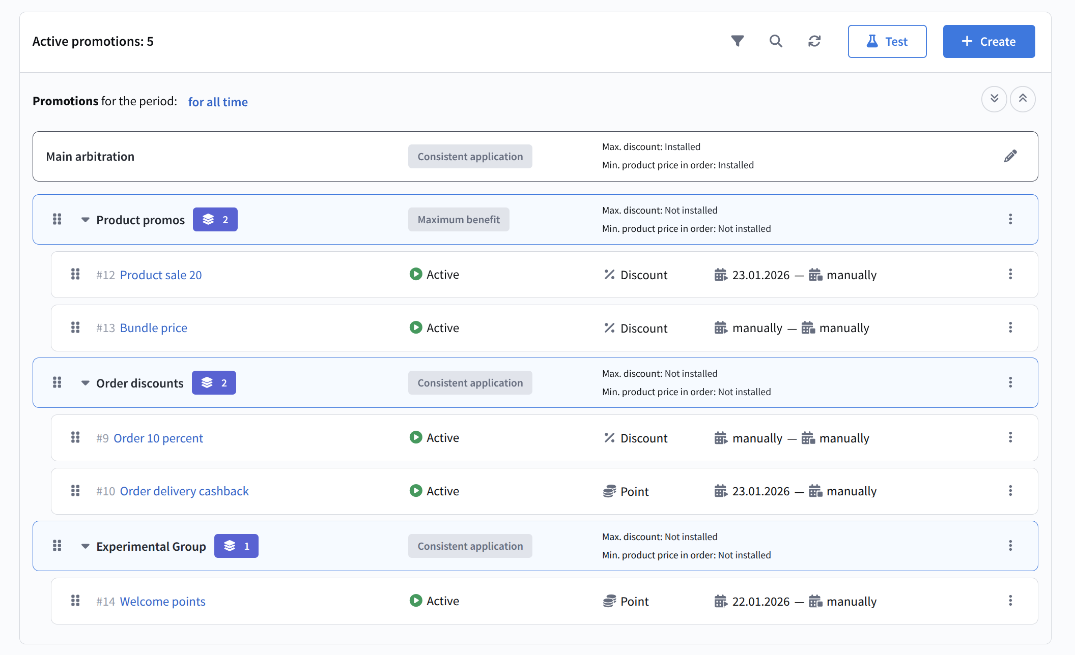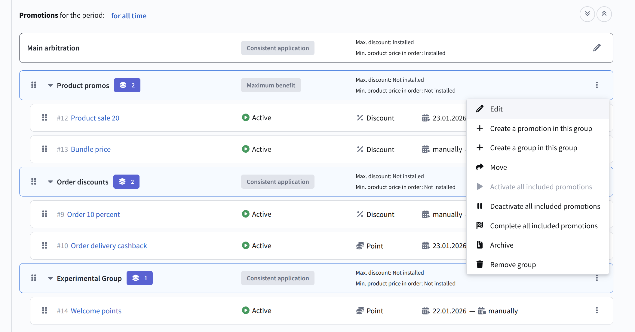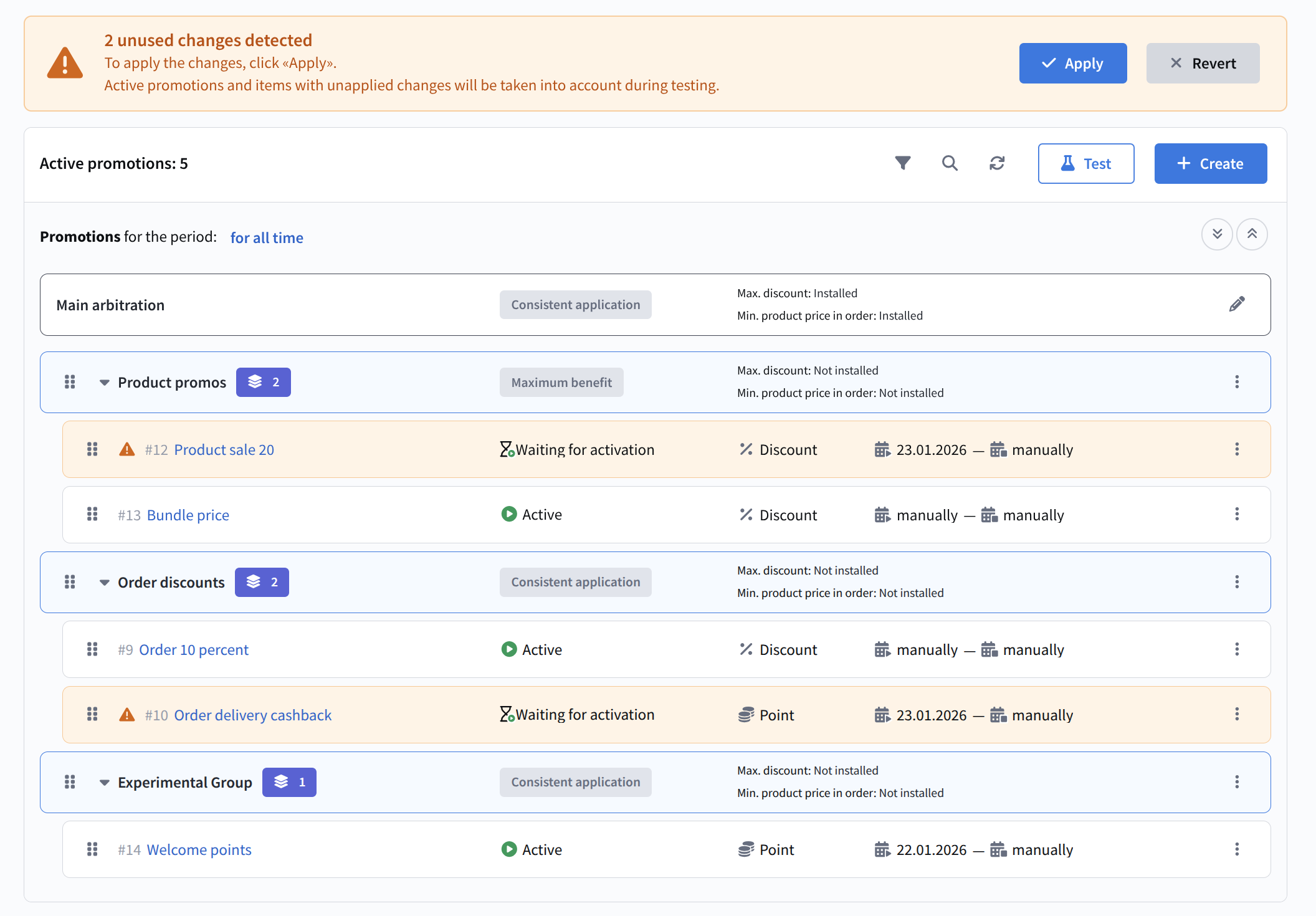 As with promotions, changes to group structure and promotion order must be applied. Until applied, changes are considered only in test mode. The final result of applying promotions is always additionally processed by the loyalty program's main arbitration. All actions applied to a group (activation, deactivation, archiving) cascade to all nested promotions and subgroups.