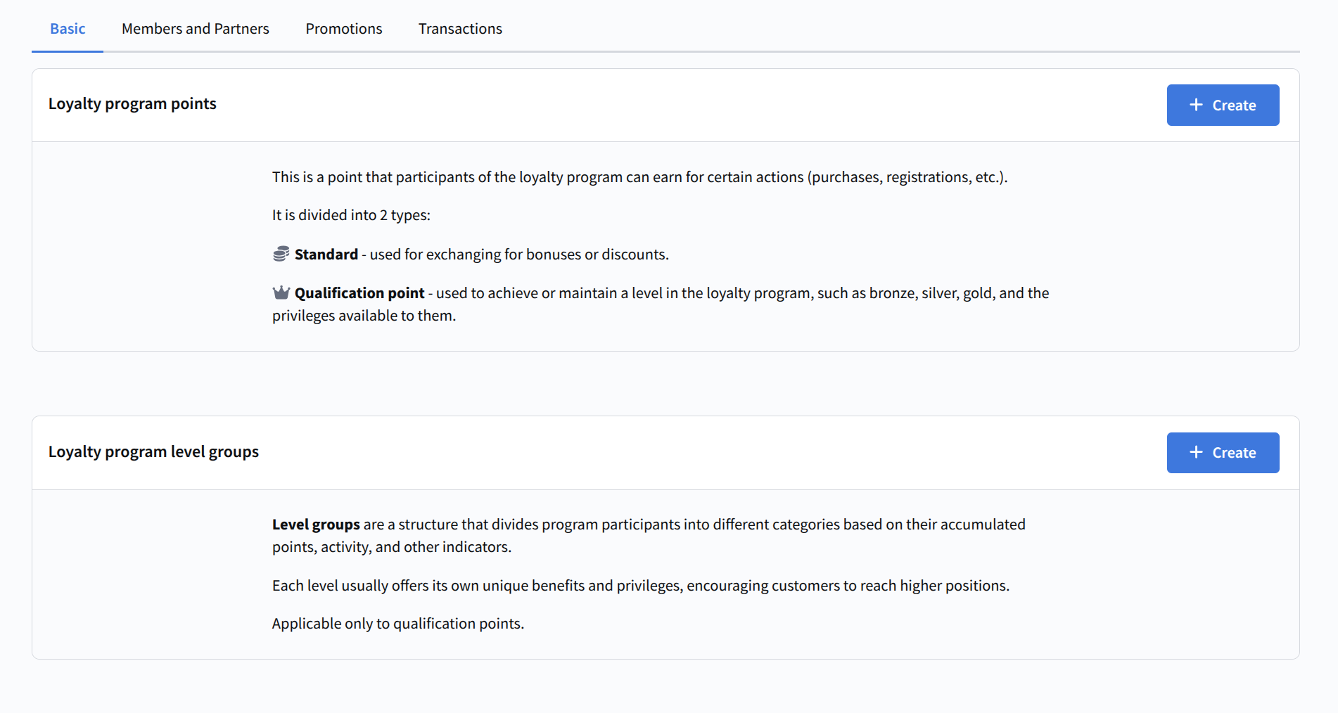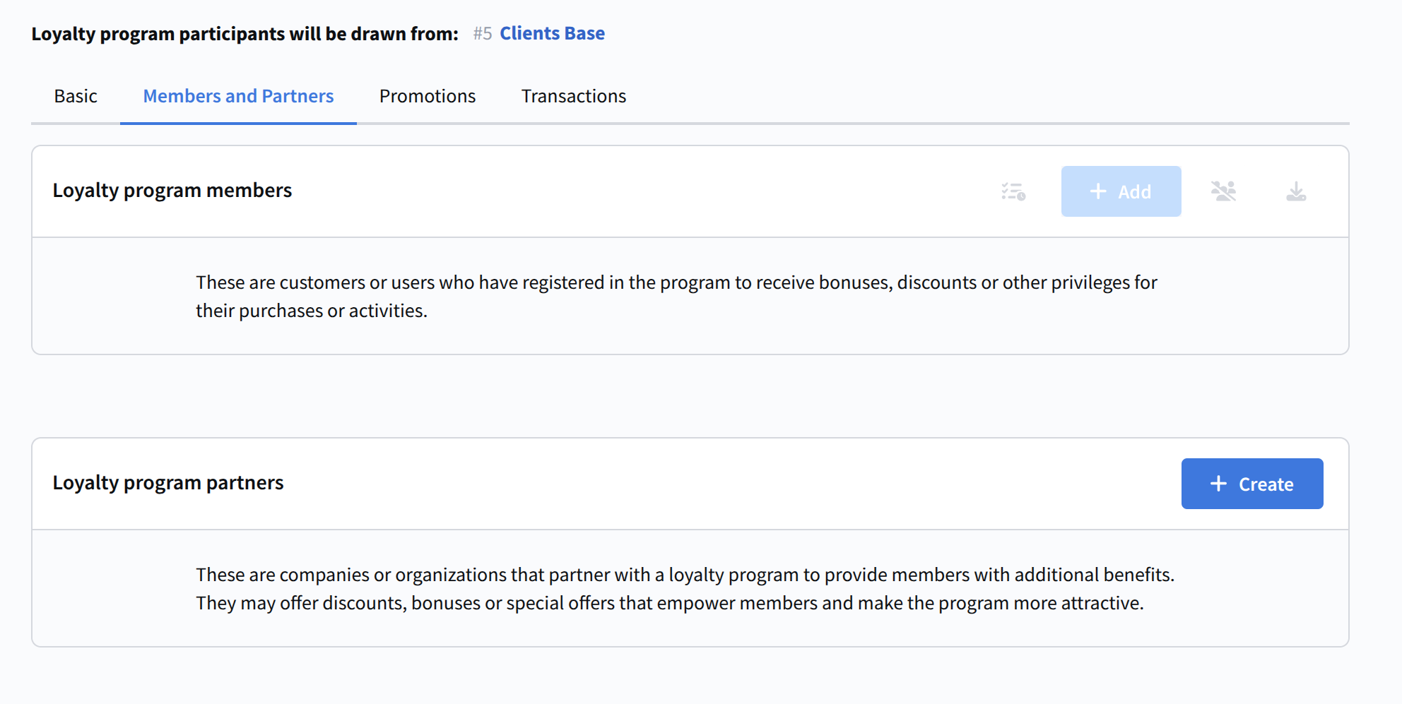 The Members and partners section is used to manage loyalty program members (end users) and partners (companies providing additional benefits).