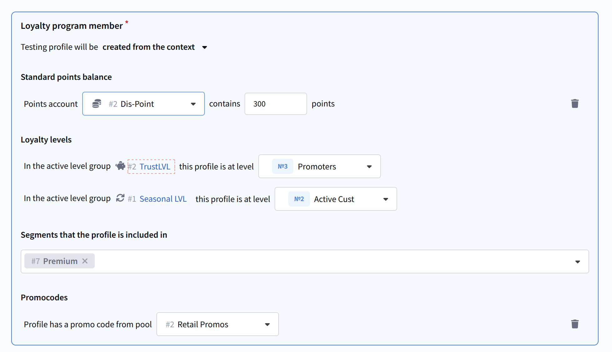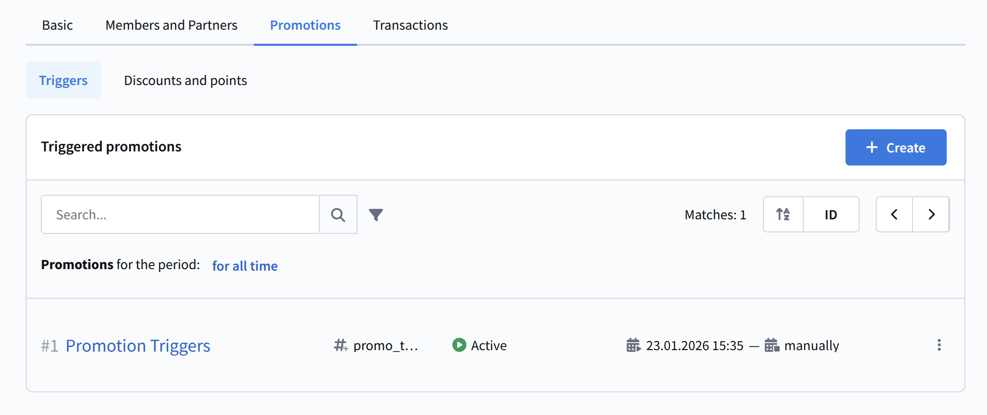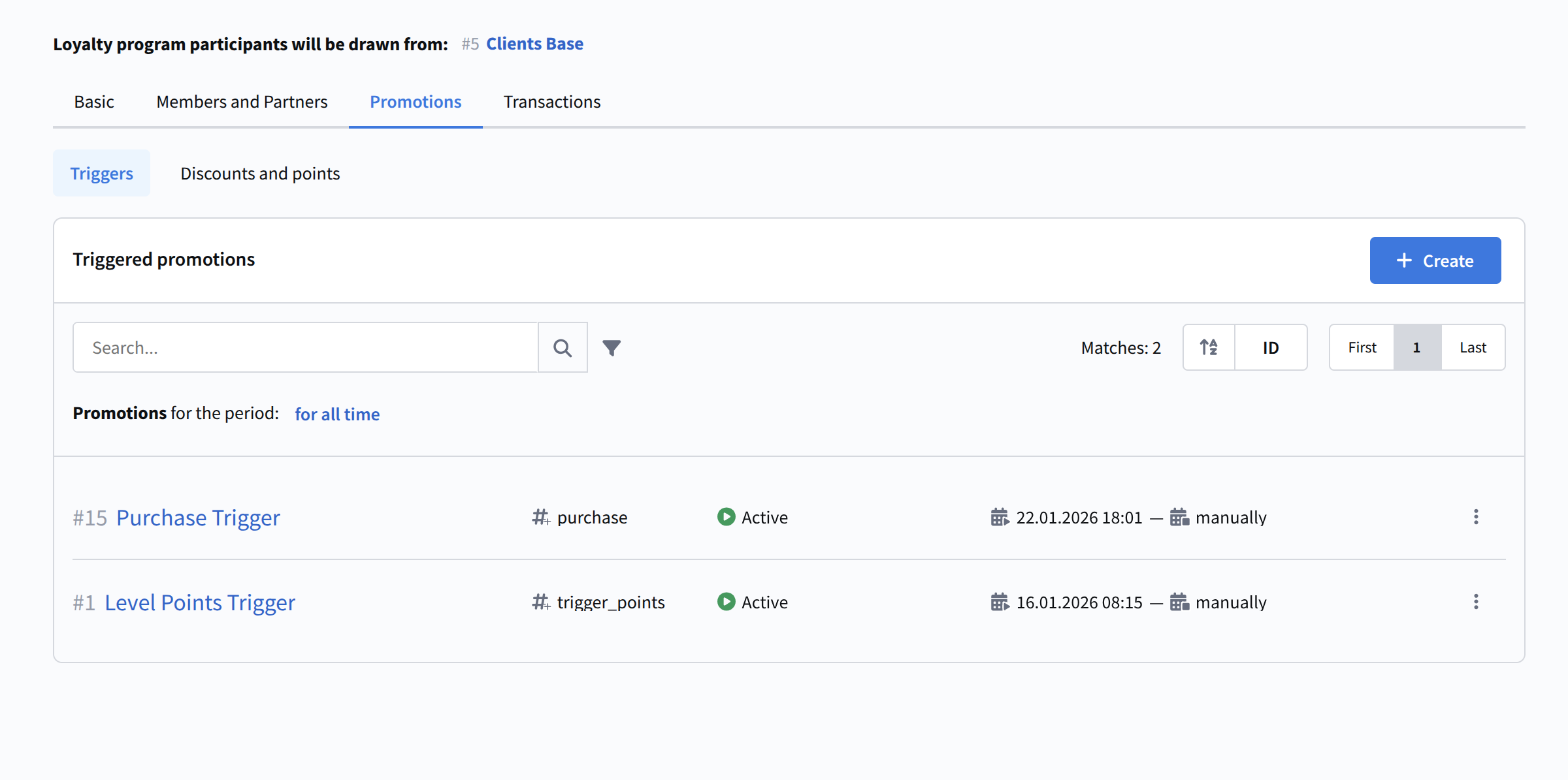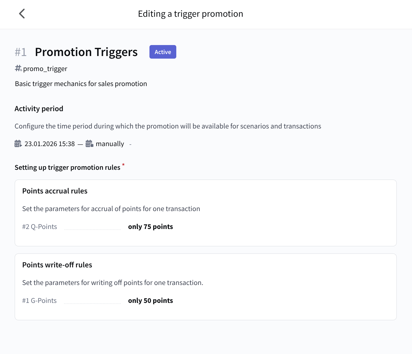Trigger promotions are marketing activities in which, when rules are met (triggers are activated), a participant becomes eligible to receive bonus points. In other words, this is a set of rules according to which a customer can earn (and later lose) loyalty points. Such promotions are linked to triggers when creating campaigns and scenarios.