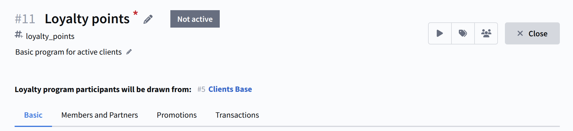 After creation, you will be taken to the loyalty program editor, which consists of several tabs: General, Members and partners, Promotions, and Transactions: