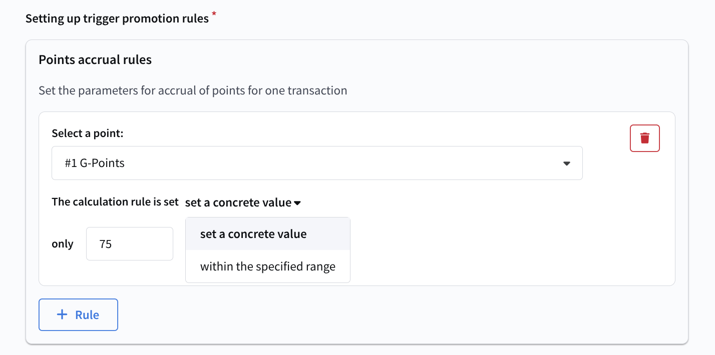 Next, define the promotion rules. They control how points can be accrued and deducted for participants. Accrual and deduction rules are configured as separate conditions. Specify the point type to which the rules apply and the exact value or range of points to be changed: