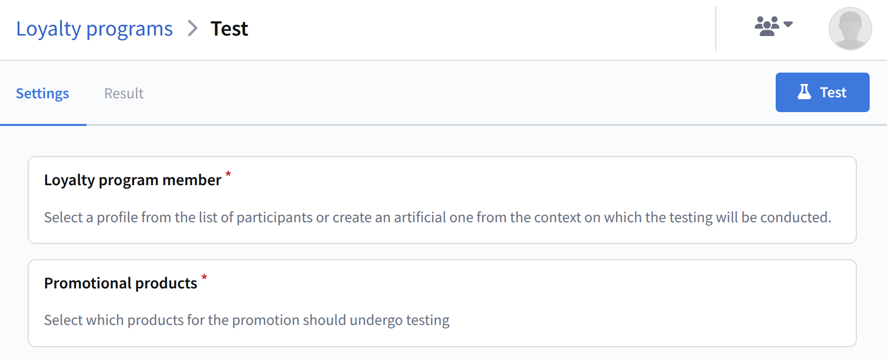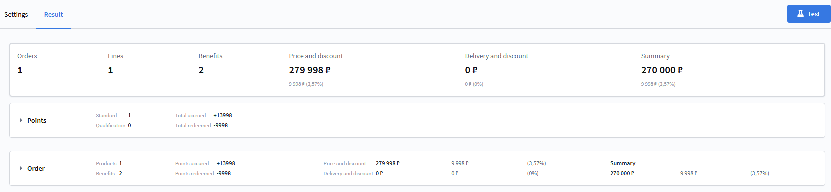 To check how promotions apply to an order, click Test to open test mode, where you can set order and participant parameters and view the result, including unapplied changes.