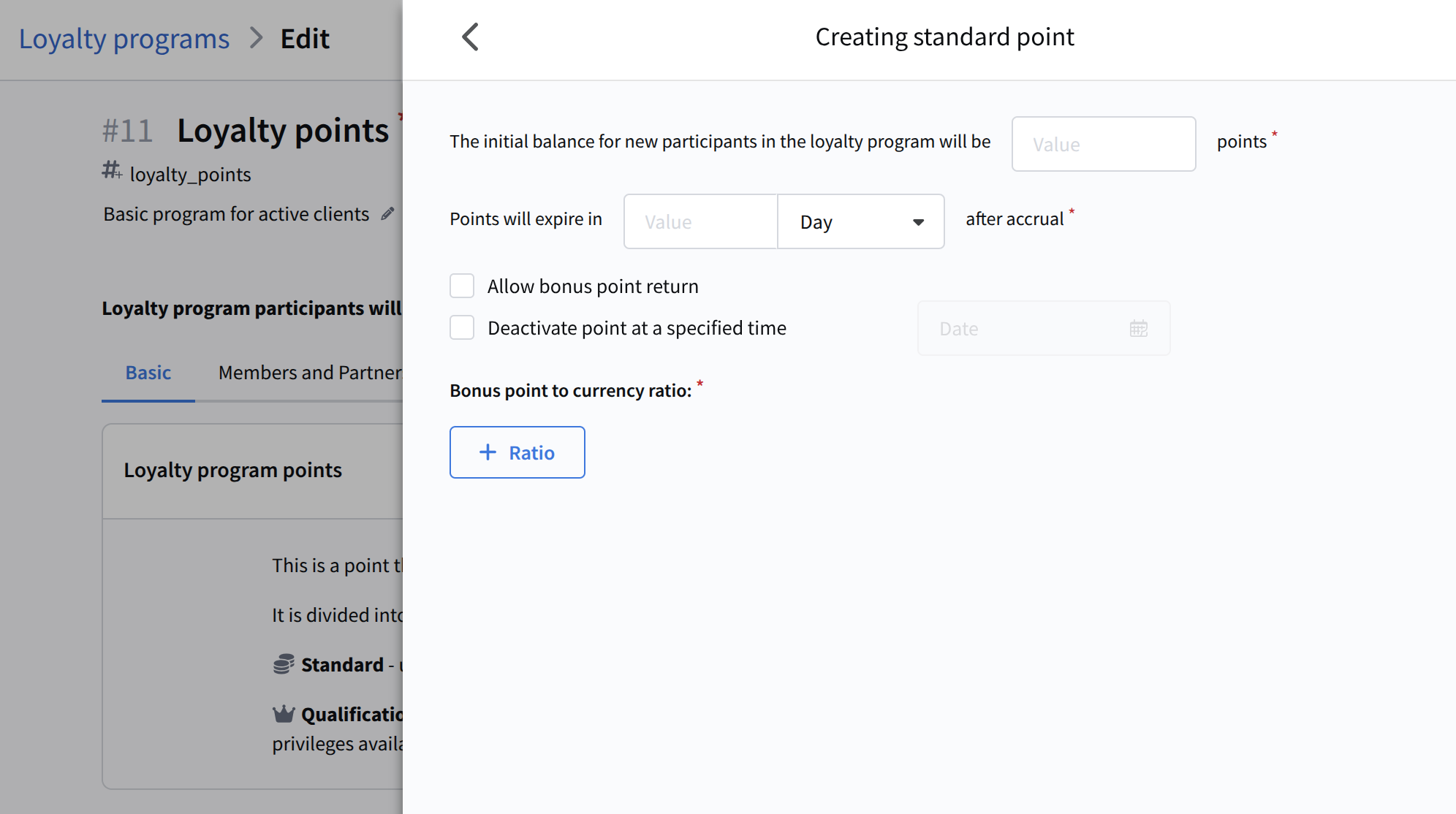 - Points validity period — defines how long accrued points remain valid. The period can be set in days, weeks, months, or years. After expiration, points are canceled.