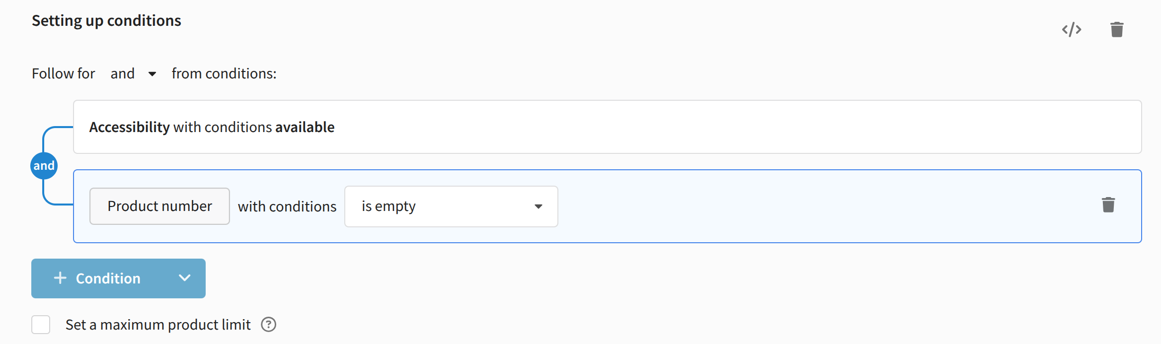 The same block contains the "Script" button, which opens an editor for manual condition writing. After setting conditions, you can define a product count limit. This limit applies to the selection result after condition filtering.