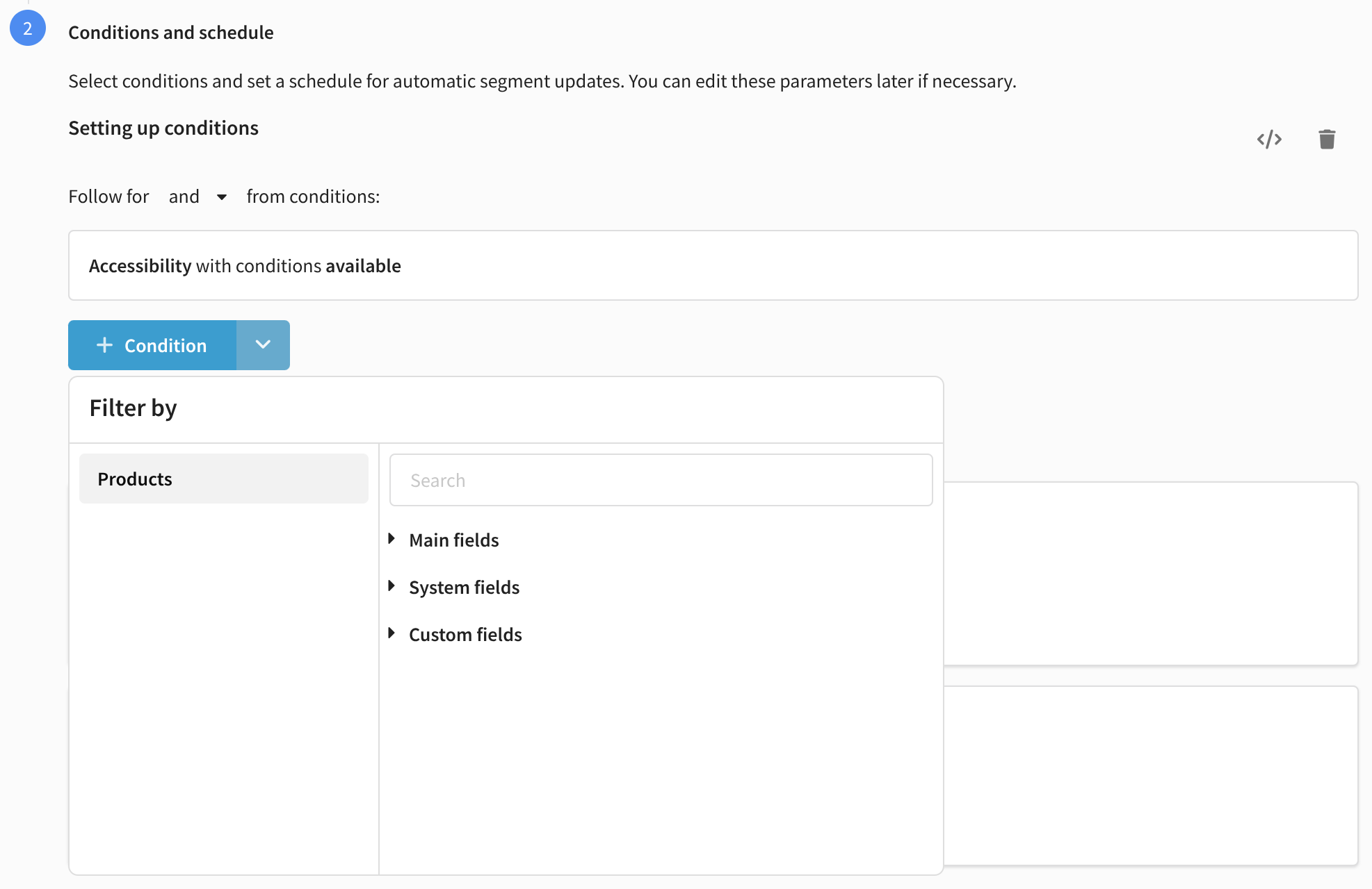 Product and SKU segmentation works the same way as profile segmentation in the platform. More details about the condition builder and segmentation logic are available in this section.