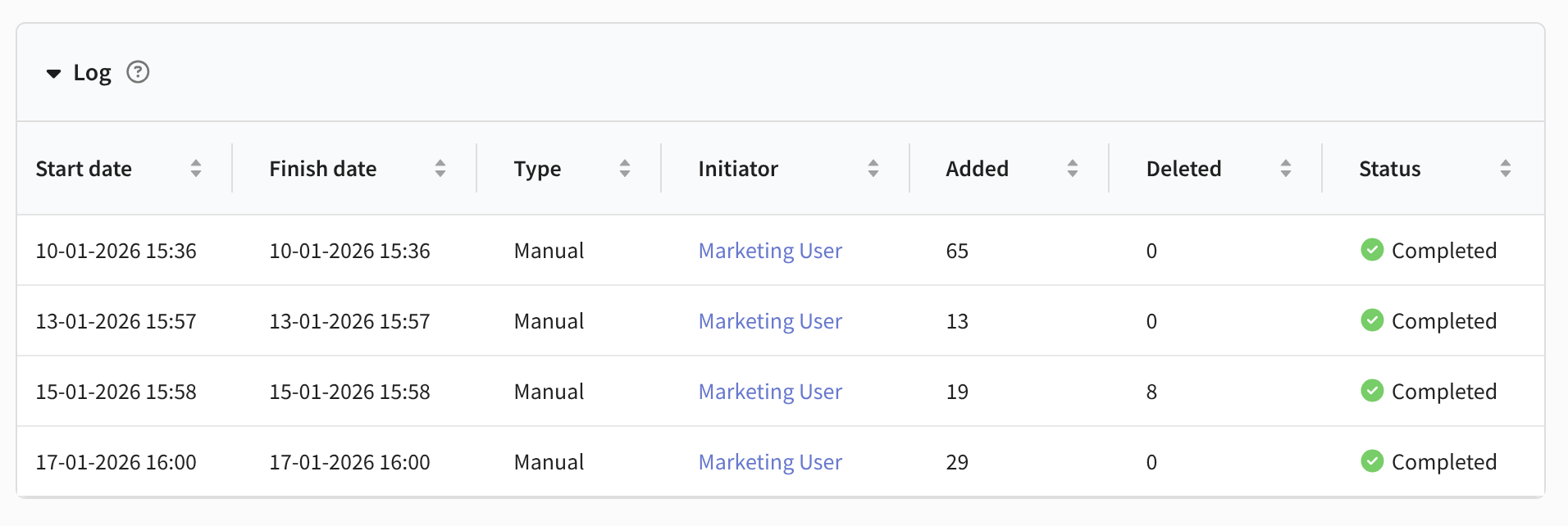 - Start date: time when the segmentation process started (adding/removing by conditions).
