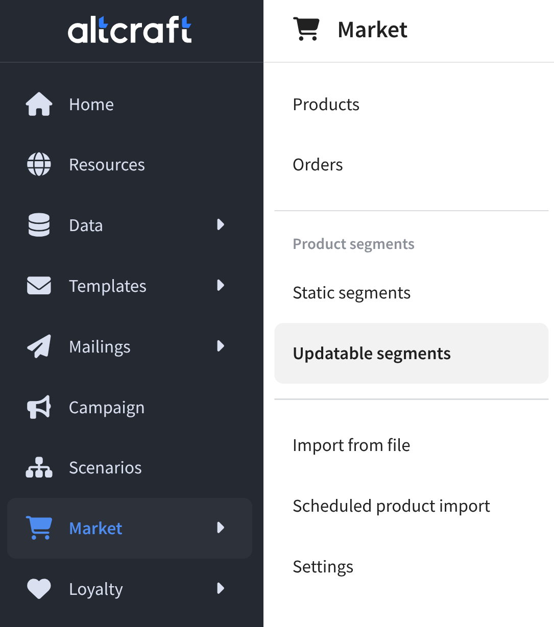Updatable segments are product and SKU sets that are recalculated on a schedule based on defined conditions. Such a segment can also be recalculated manually outside the schedule.
