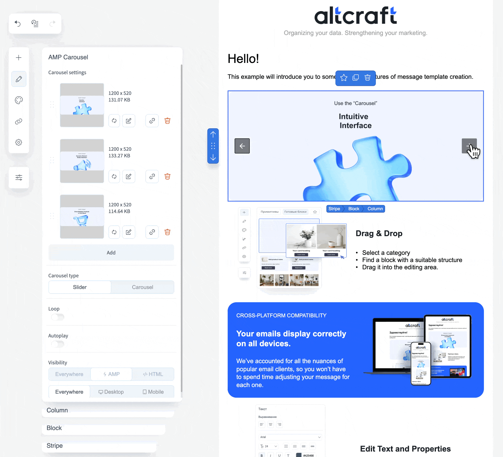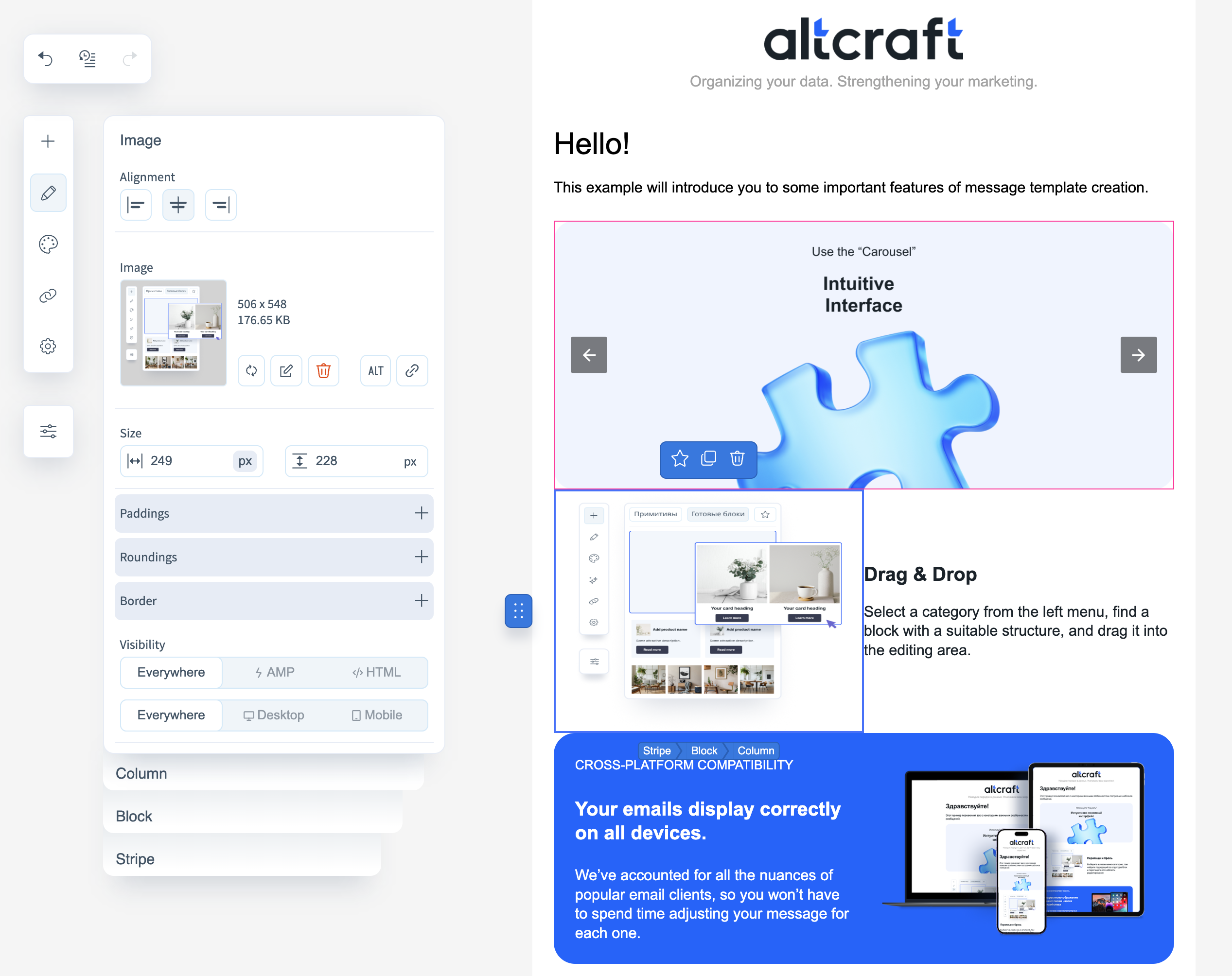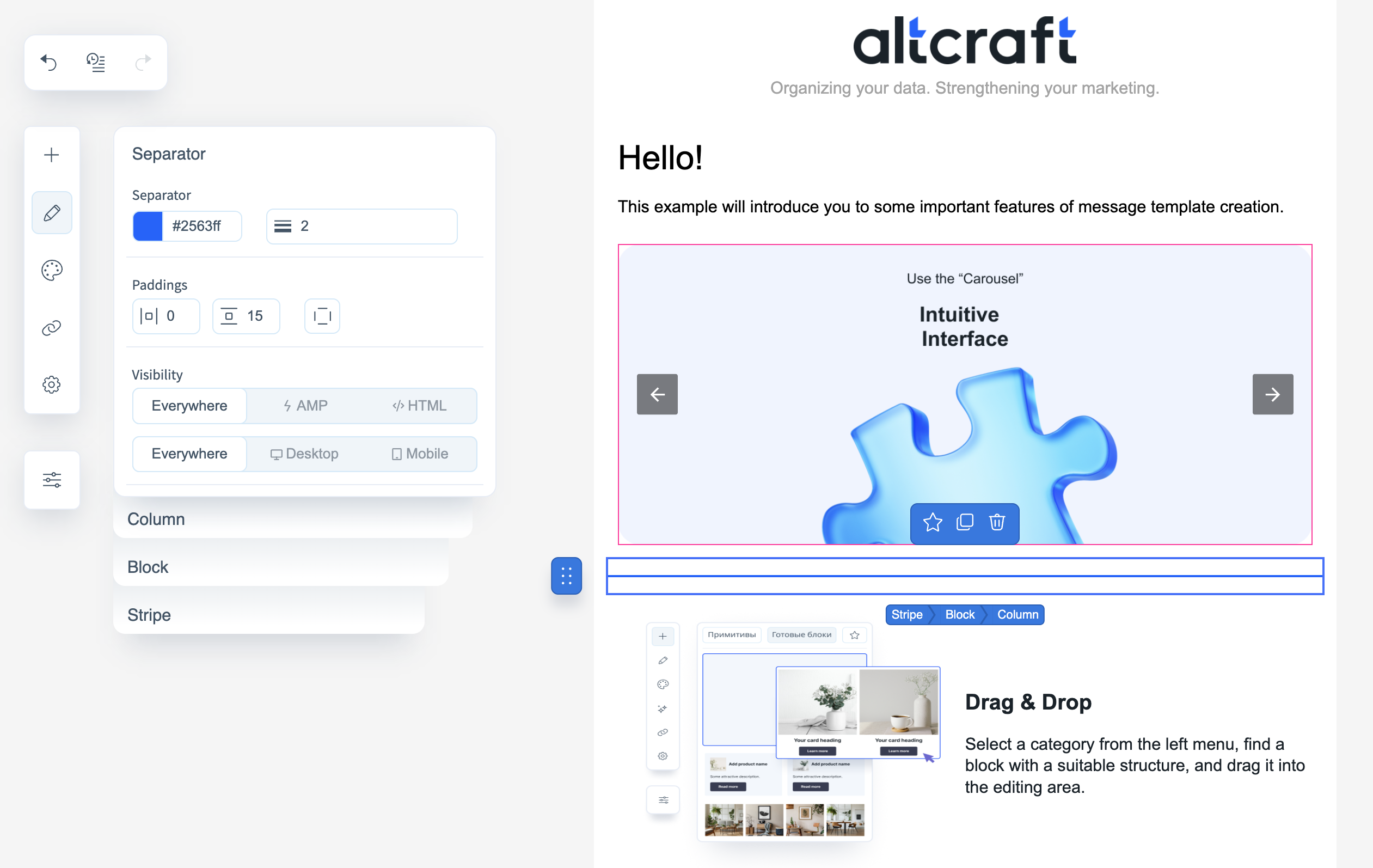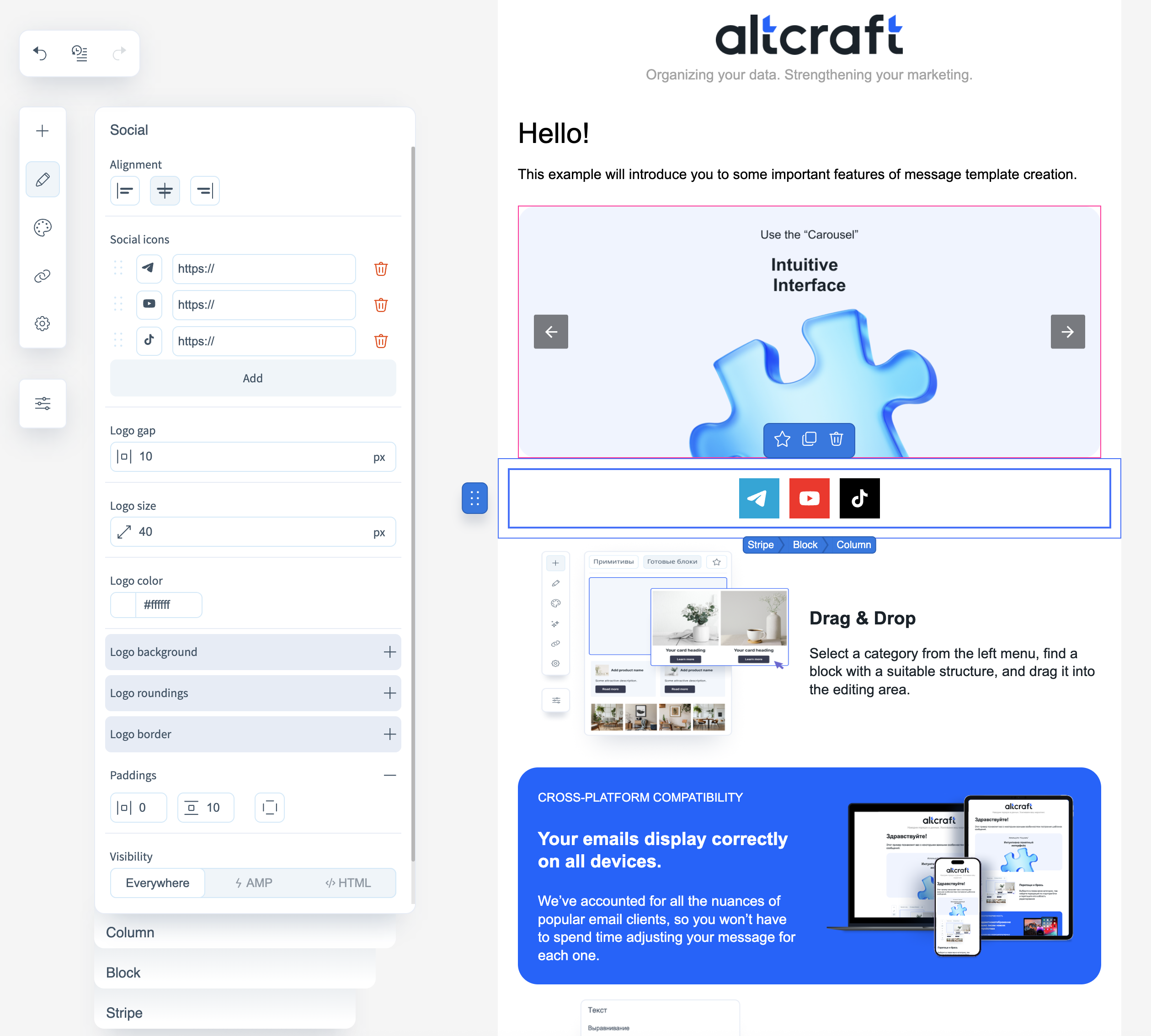 - Visibility — determines block visibility in different versions of the email (HTML/AMP/everywhere, desktop/mobile).