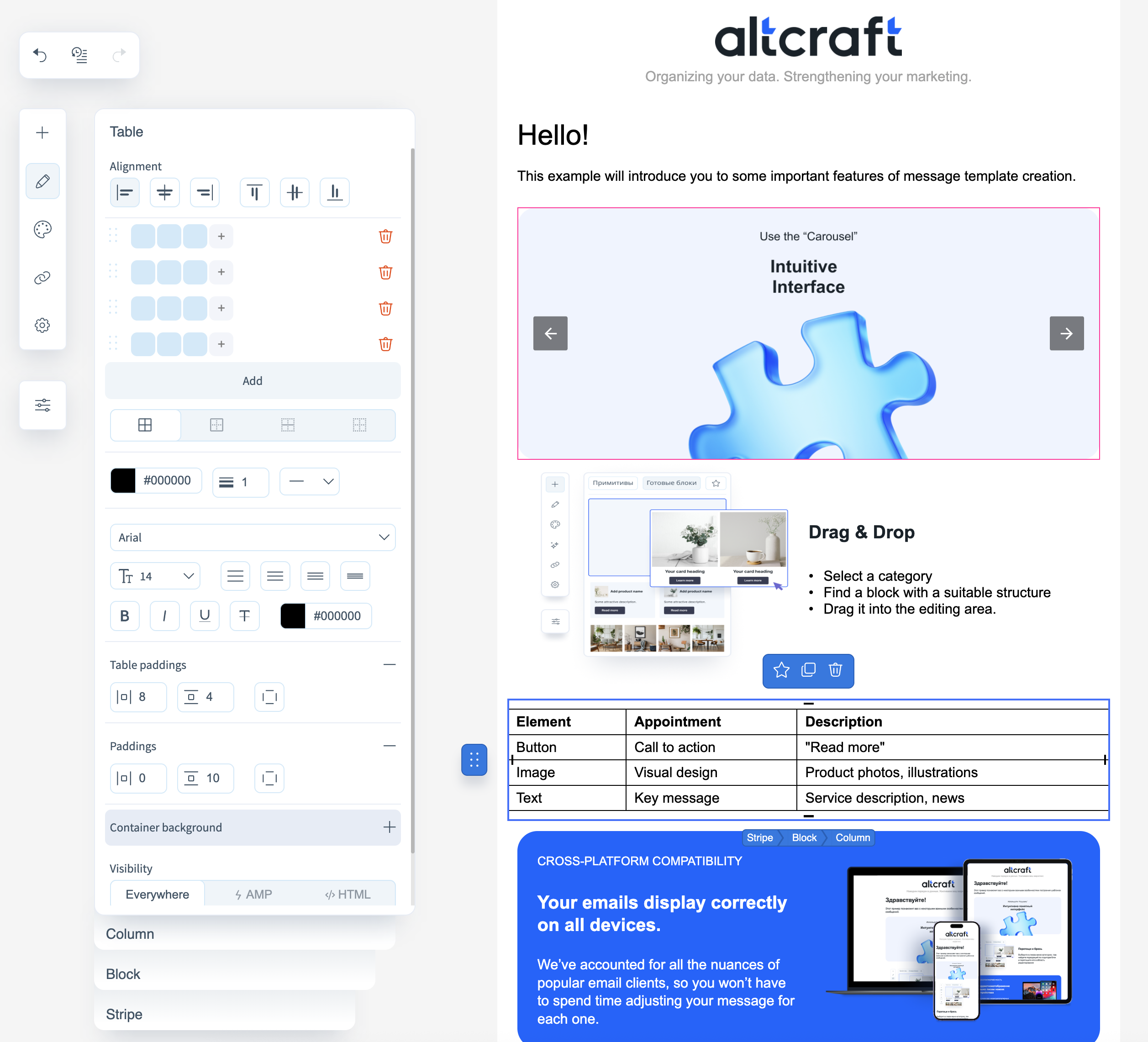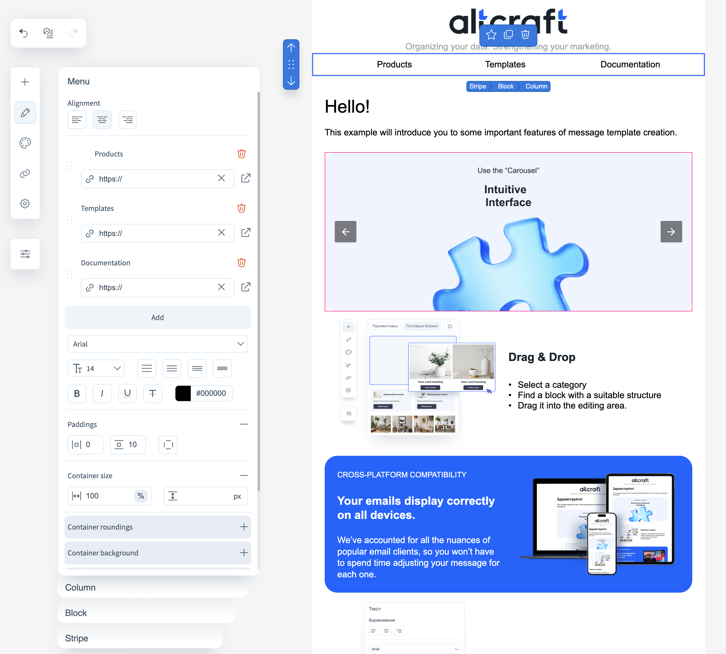 Block editor for email template is a tool for creating, editing and customizing marketing email templates and emails without writing code. It is designed for marketers and designers who want to quickly assemble professional emails with an easy-to-use interface using blocks, visual elements and design customizations.