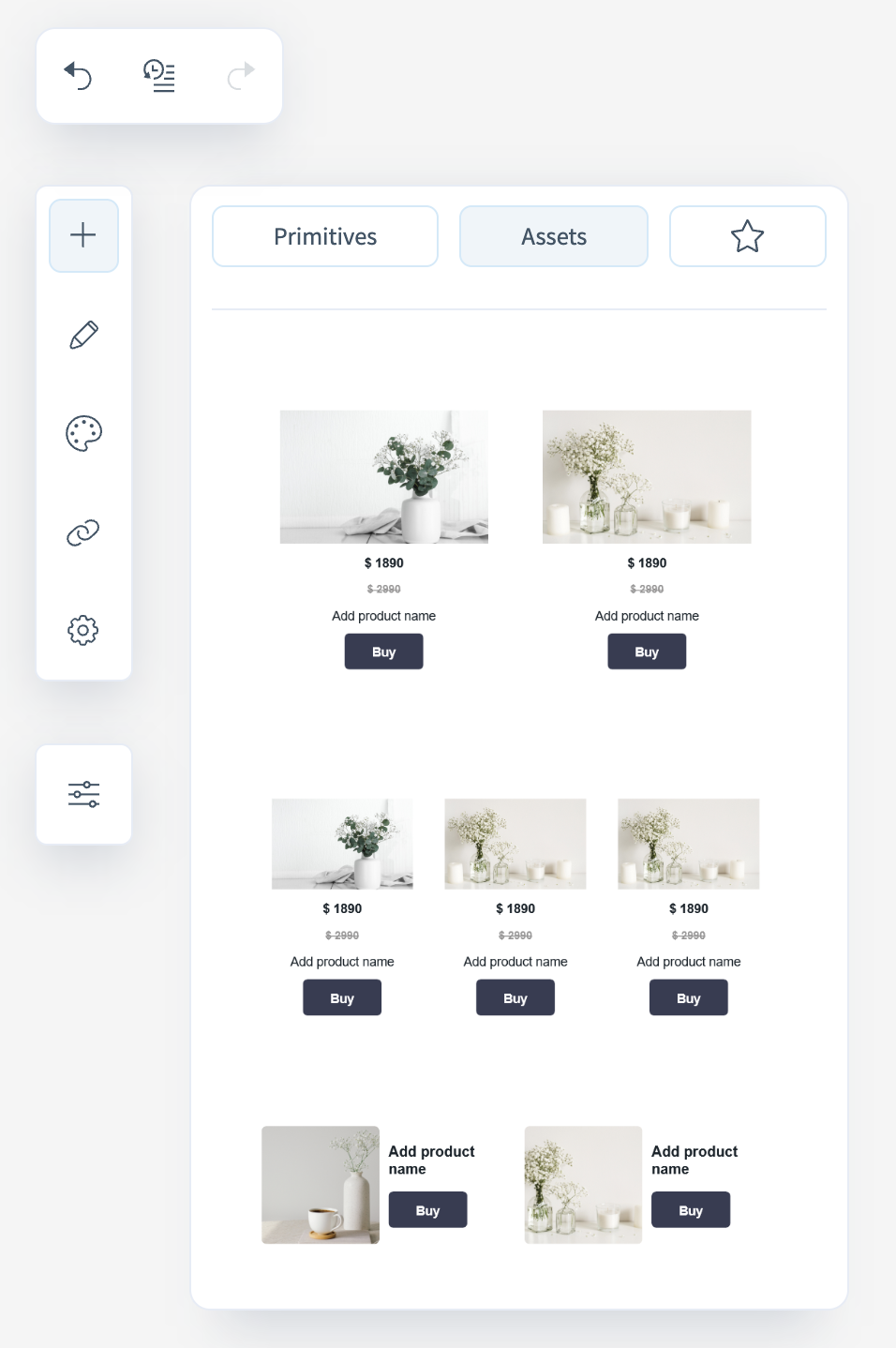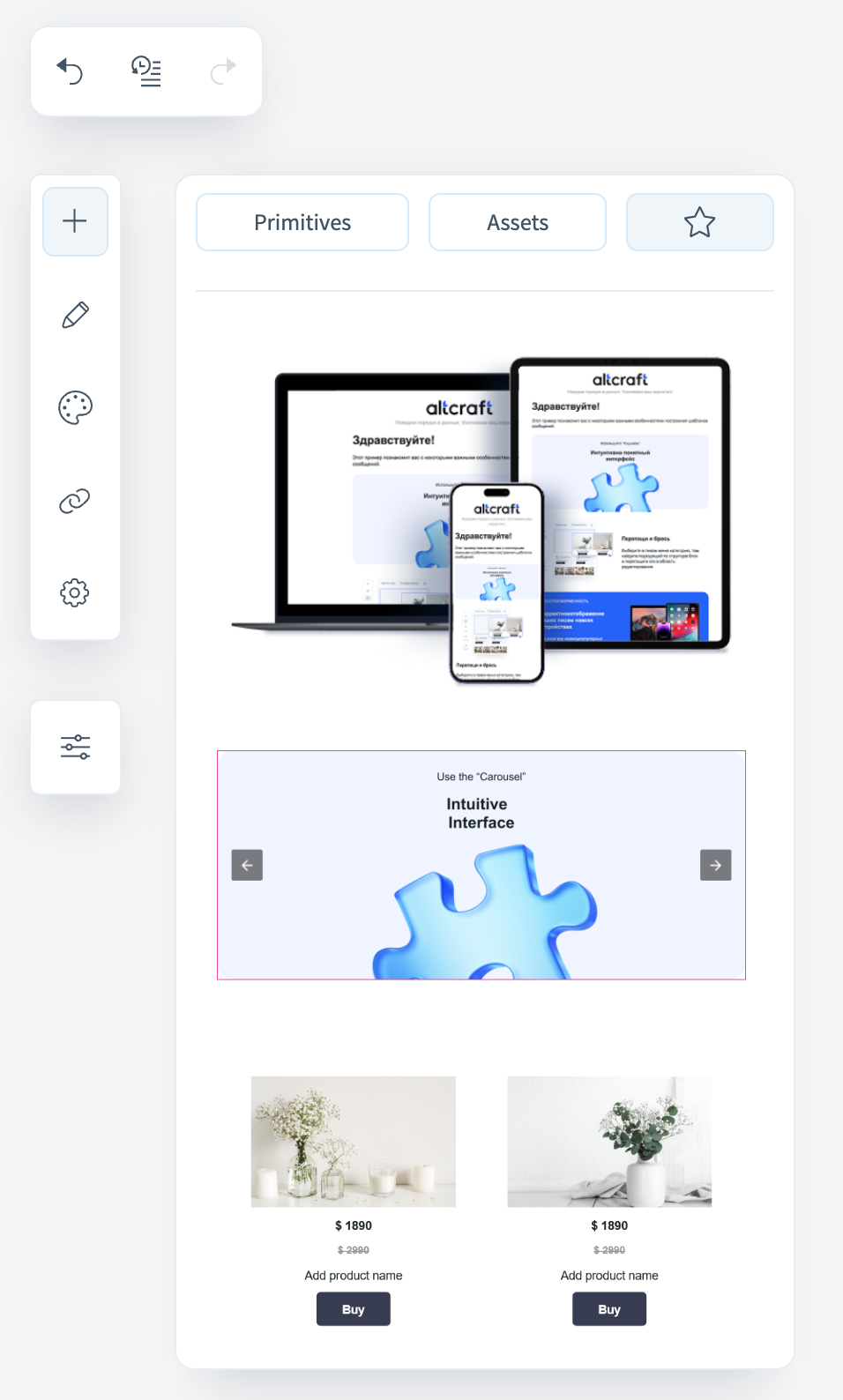 - Add — opens the menu of primitives and ready-made blocks for inserting into the template;