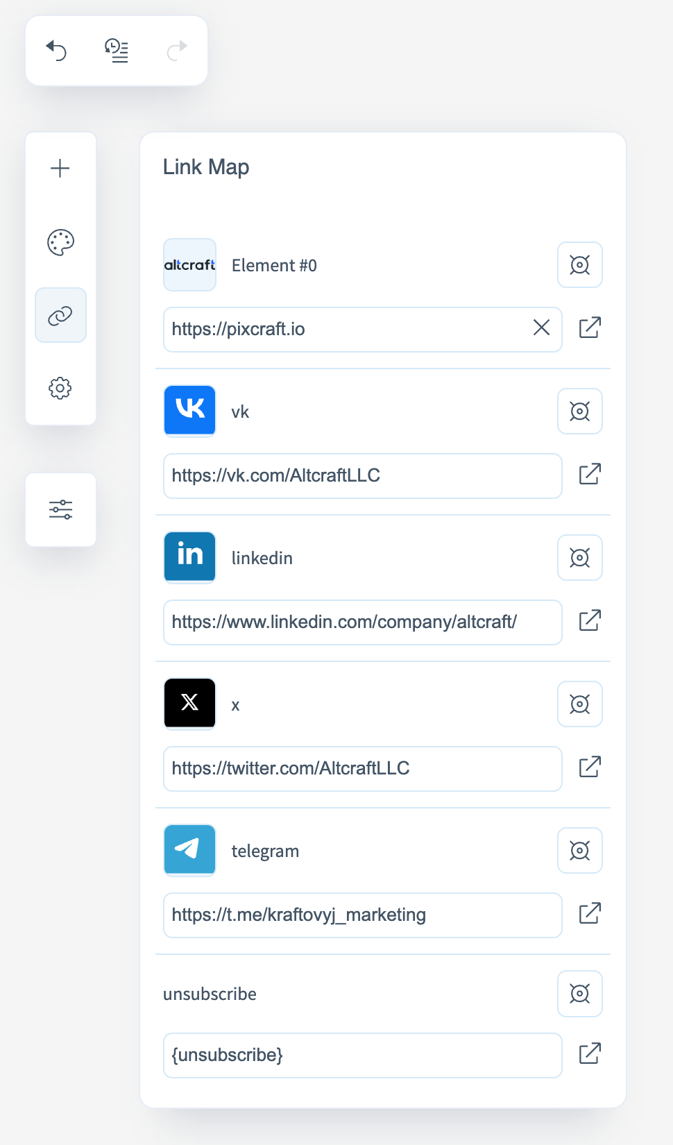 - Link Map — displays all links used in the template for review and editing;