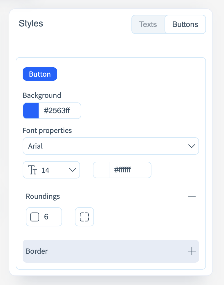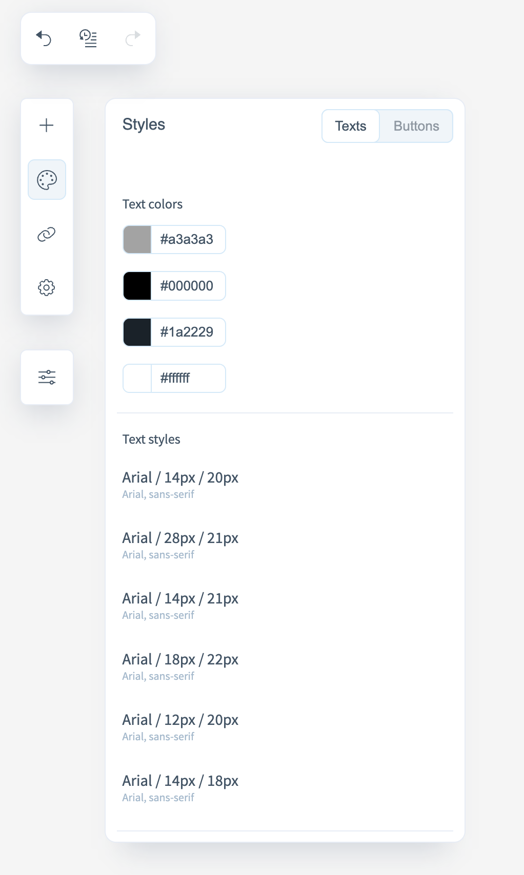 To maintain visual consistency and follow a unified design system, use the "Styles" section. Here you can monitor the colors and text styles used within blocks and buttons.