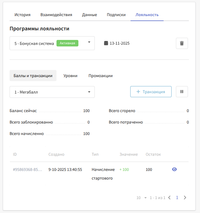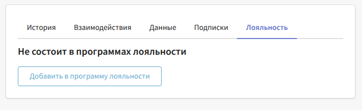 If the profile is already registered in one of the loyalty programs, this tab shows the profile’s points and transactions, its tier in the loyalty program, and participation in the program’s promotions. From here, you can also perform points transactions for the profile: