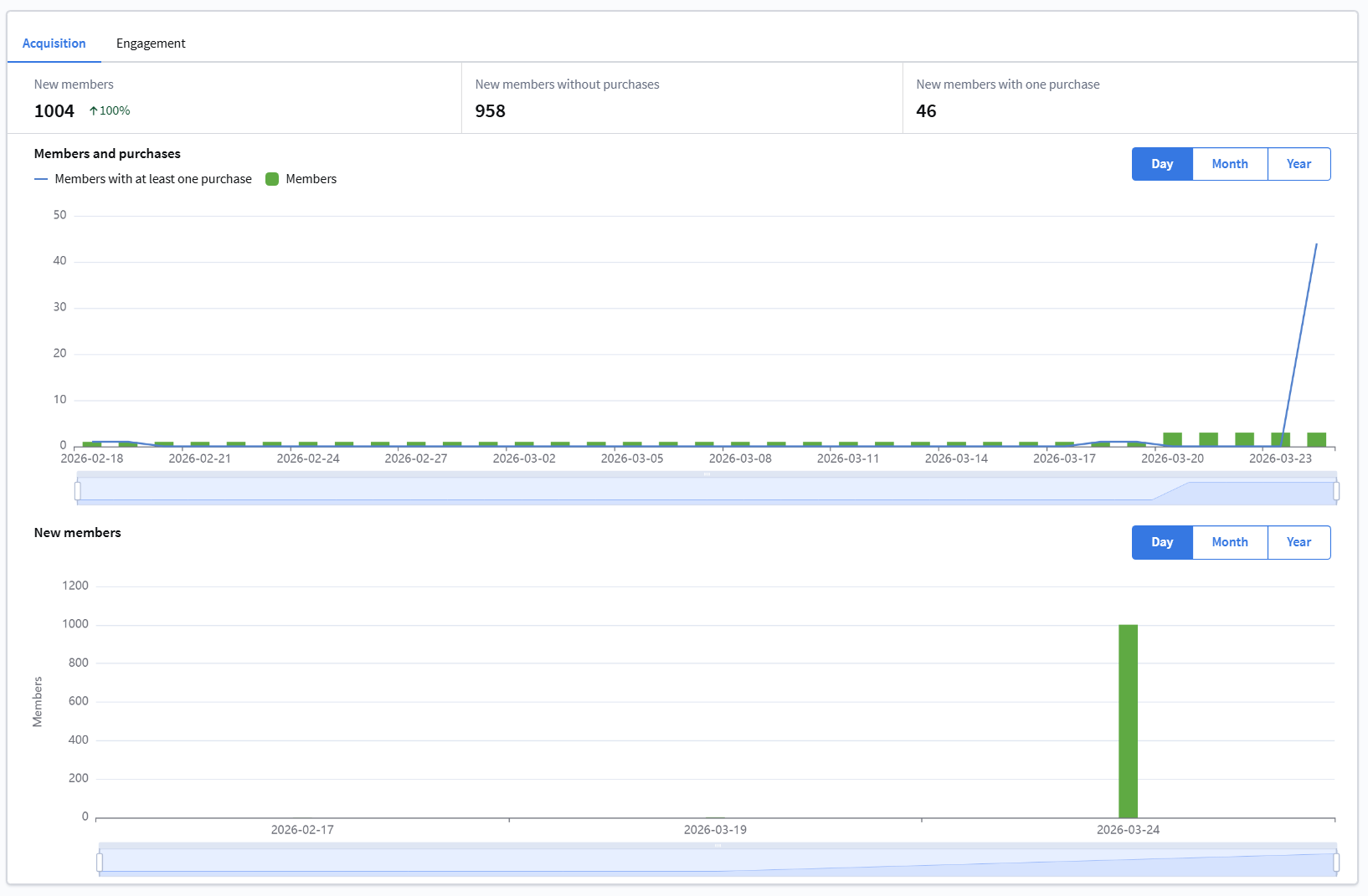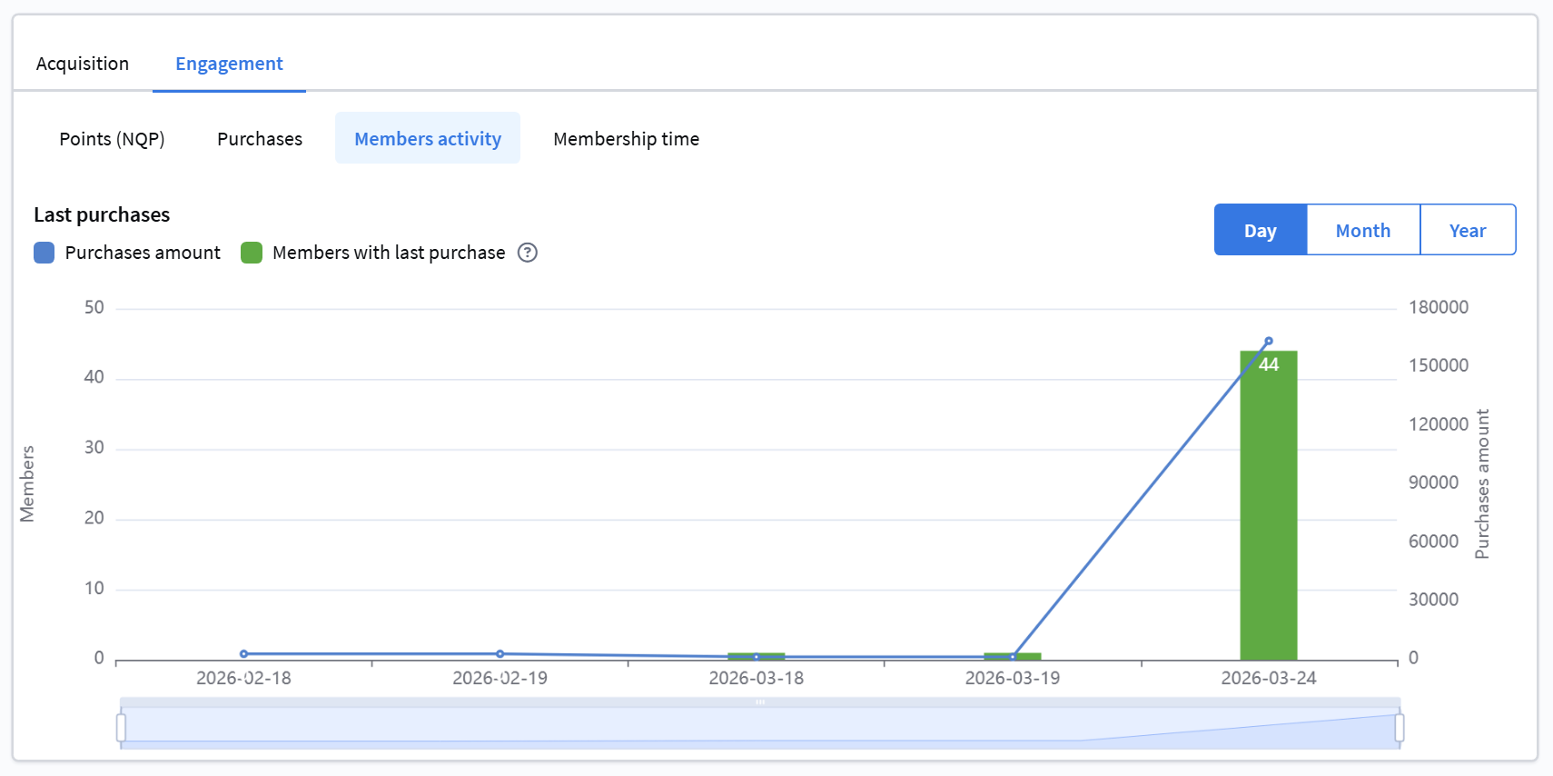 This section shows member engagement based on activity. It includes the Points, Purchases, Member activity, and Membership duration tabs.