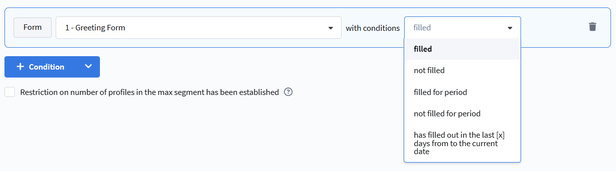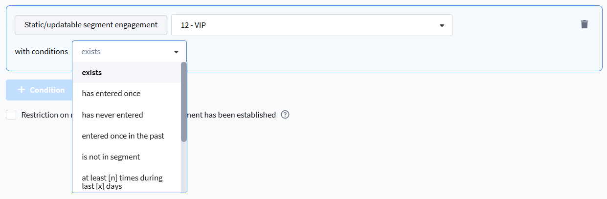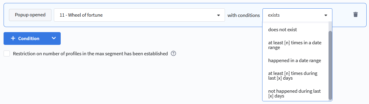 - never entered during [x] days — the profile has not entered the segment in the last X days.