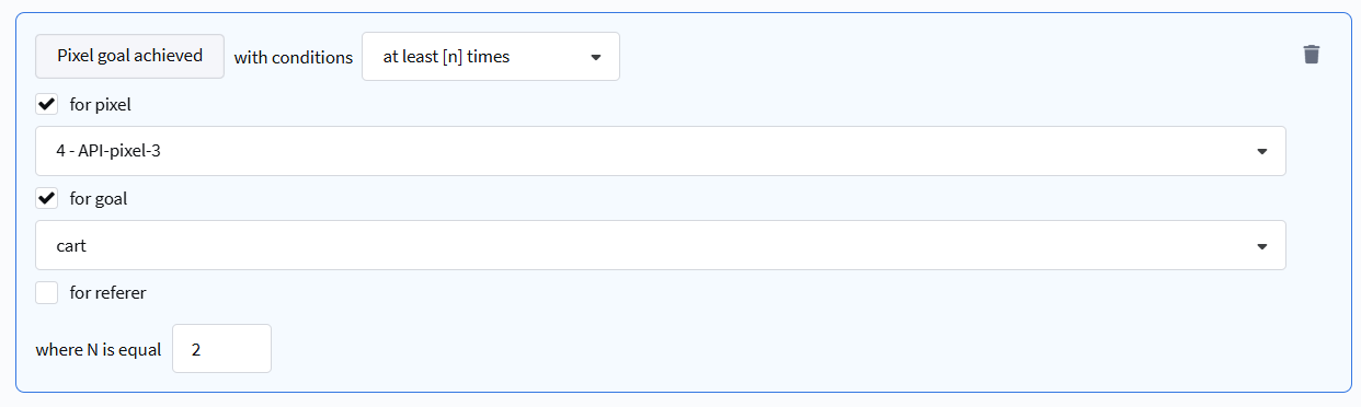 - At least [n] times / Not happened — selection based on the number and frequency of actions performed. Can specify goal, pixel, or referer (traffic source).