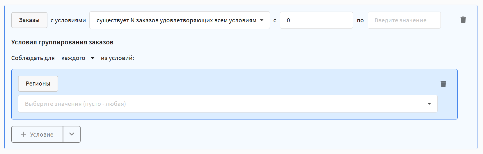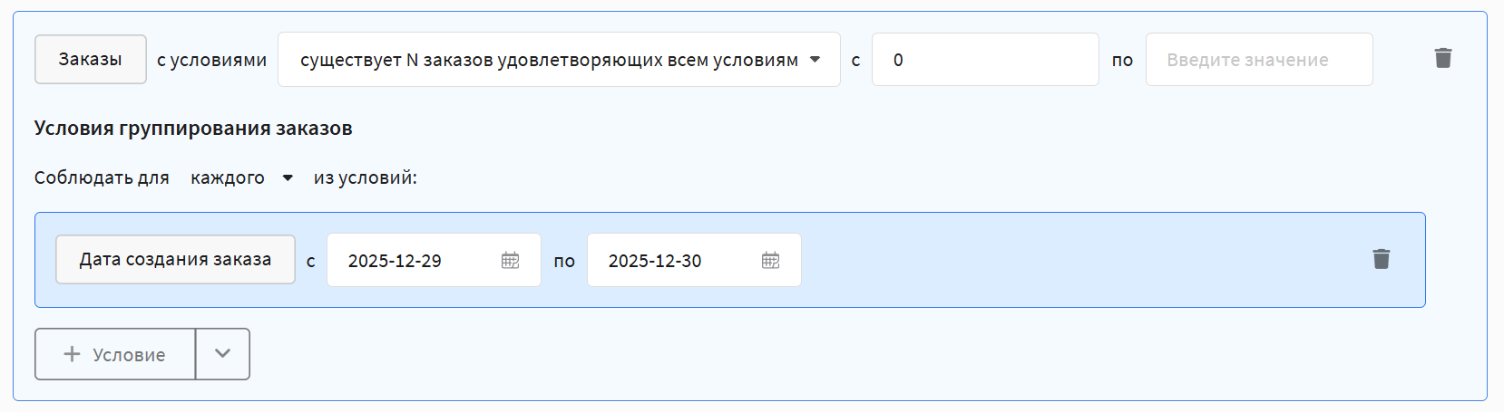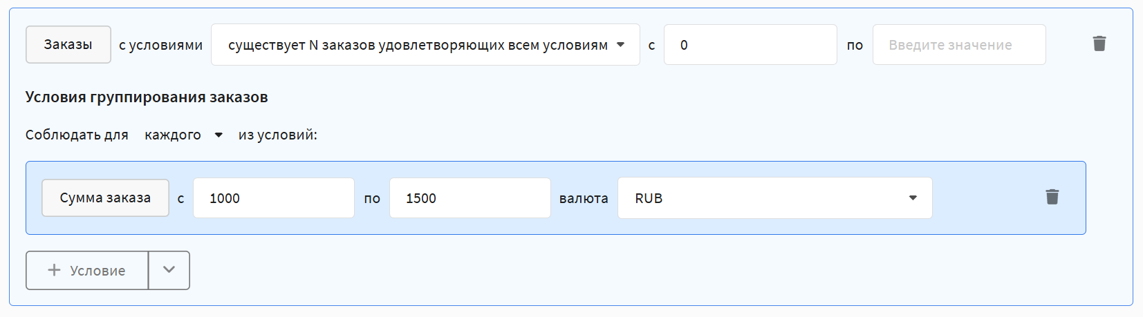 In any of the rules described above, you can set additional conditions to specify which orders to take into account. The following parameters are available: