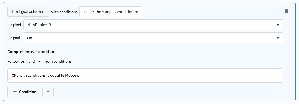 - Meets / Does not meet complex condition — extended selection based on additional data passed when registering a goal via API.