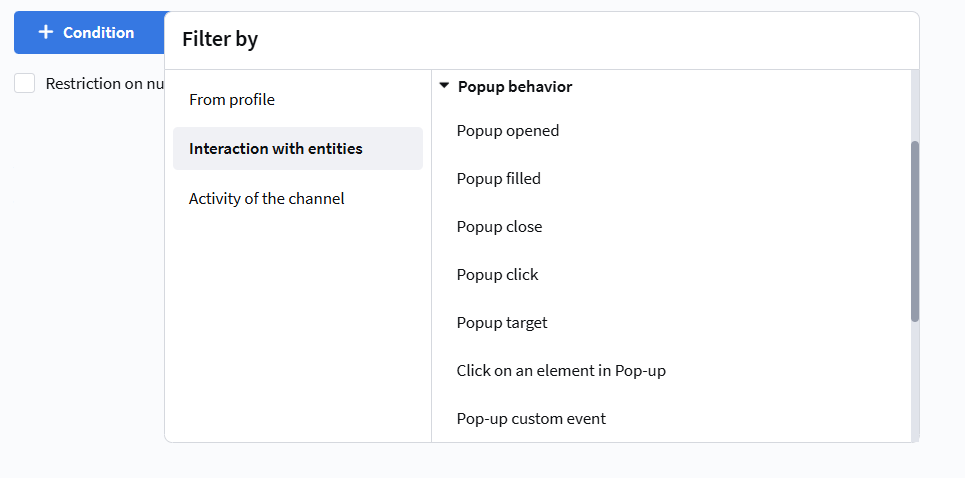 This section contains rules for segmenting profiles based on their interactions with various functional entities of the Altcraft platform, such as automation scenarios, forms, popups, segments, and loyalty programs.