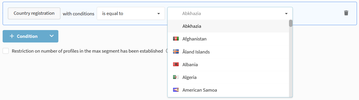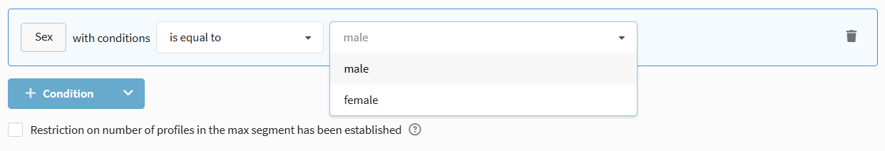 • Is equal to / Is not equal to — exact match of the subscriber's field to the segmentation rule. The value in the rule is set manually or selected from a list.