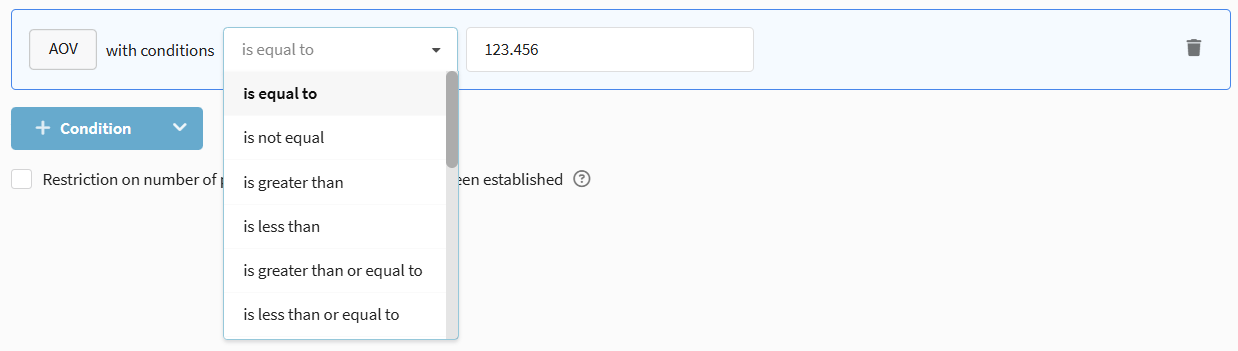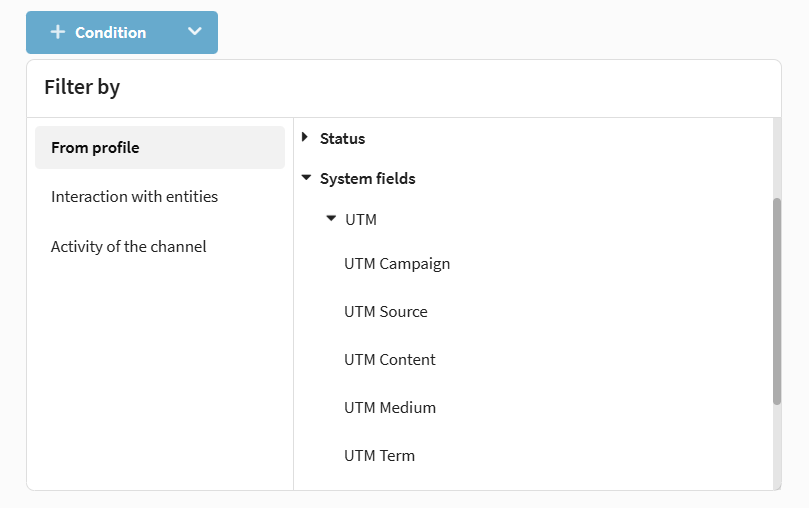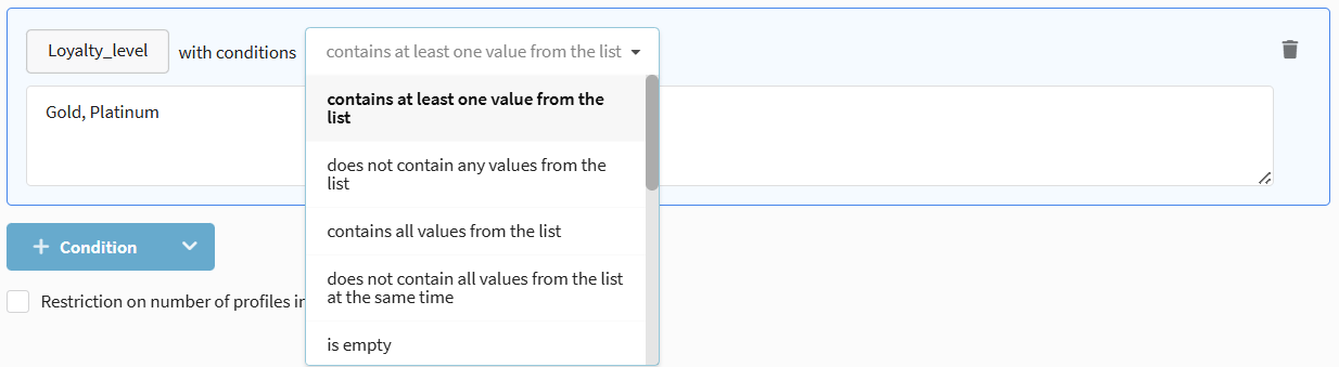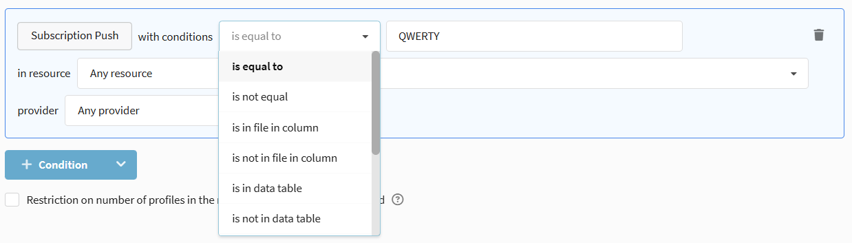 A unique identifier for each customer profile. Options available: Is equal to / Is not equal to, as well as checks for presence/absence of the identifier in lists and external sources (file, SQL, API).