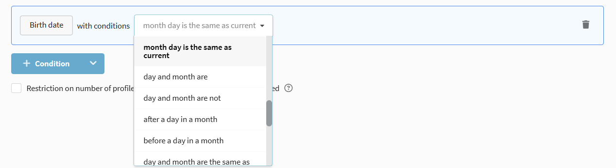 • Day and month are / are not / after / before a day in the month / day and month are the same as current — selection by day and month (without year).