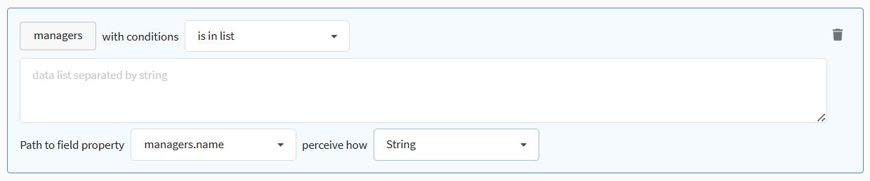 • Is in list / Is not in list — the rule looks for a match of the field in a list that can be copied into the data input area. Values must be separated by a line break (pipe).