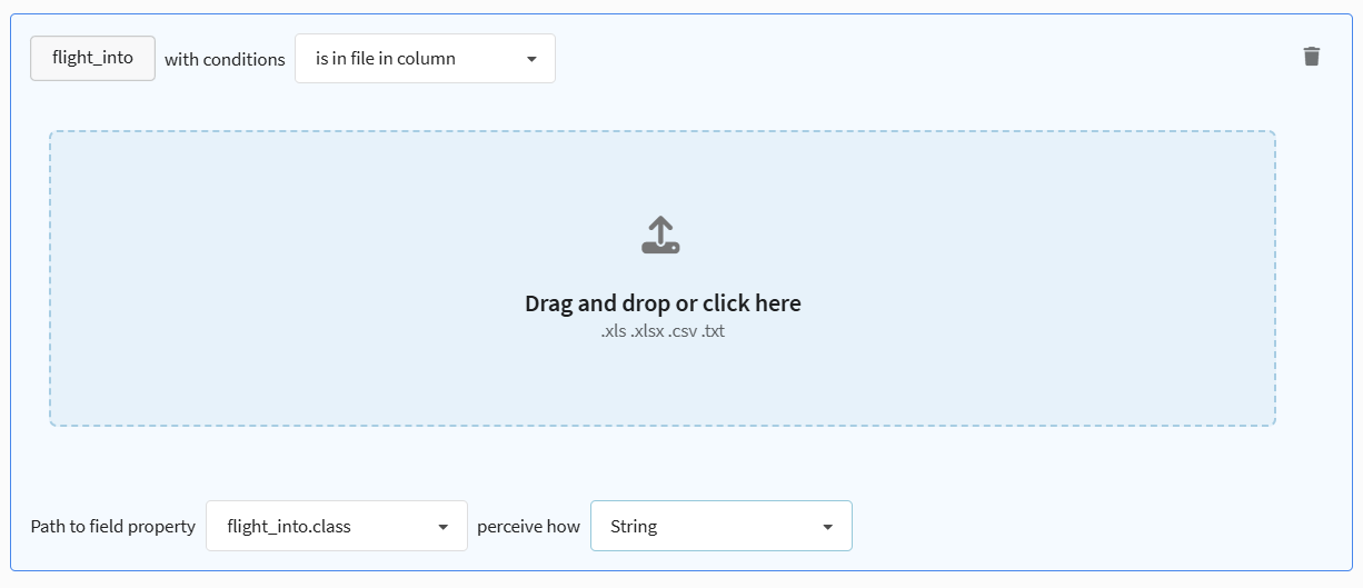 • Is in file in column / Is not in file in column — the rule looks for a match of the field in a column of a tabular file (CSV, xls) that can be attached to the rule.