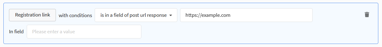 • Is in a field of post url response / Is not in a field of post url response — the rule looks for a match of the field in the response of a post method request to an external API.