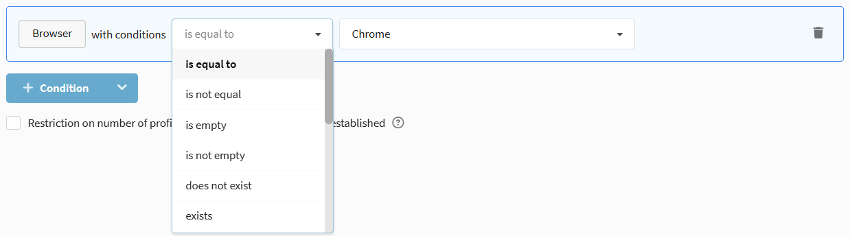 Options available: Is equal to / Is not equal to, Exists / Does not exist, Empty / Not empty, as well as checks in lists and external sources.