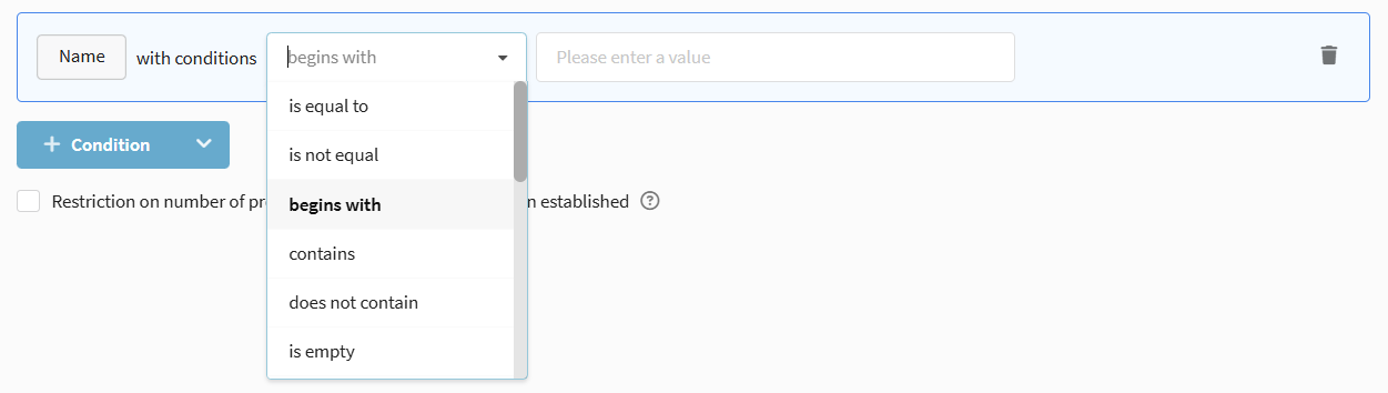 Available conditions: Exists / Does not exist, as well as checks in lists and external sources with the specification "all are in", "at least one is in", or "is not in".