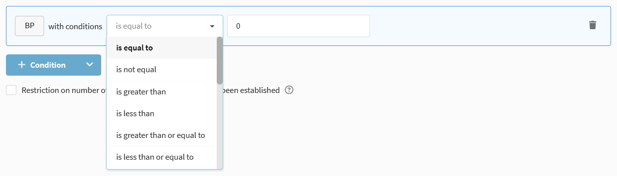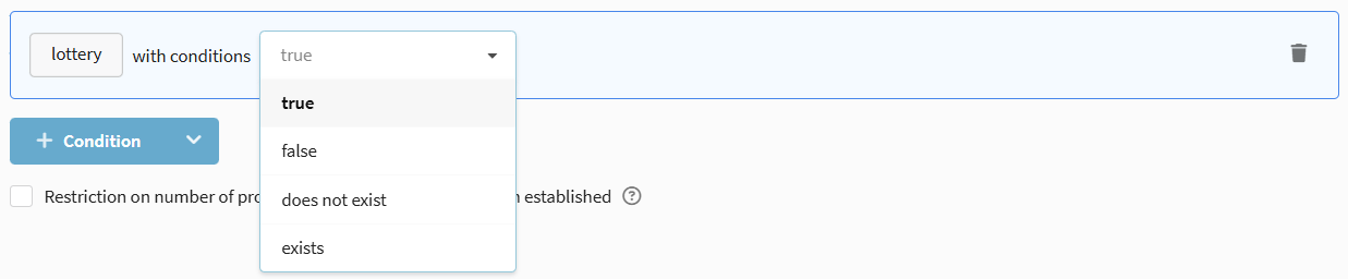 Available conditions: Exists / Does not exist, as well as checks in lists and external sources.