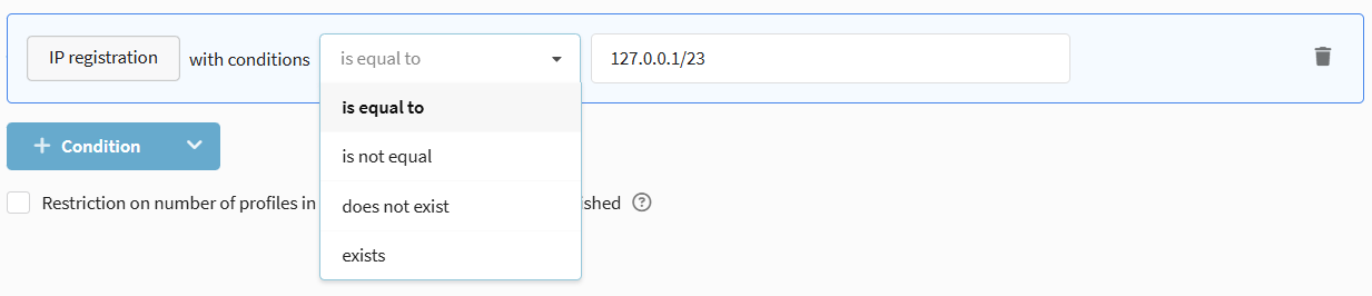 IP Address type fields store addresses in IPv4 format. These include IP Address and Registration IP Address. For IP addresses, the following operators are available: Is equal to / Is not equal to, Exists / Does not exist.