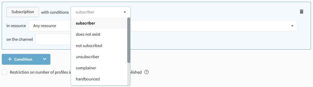 Allows selecting profiles by the presence and status of a subscription to a specific resource and communication channel.
