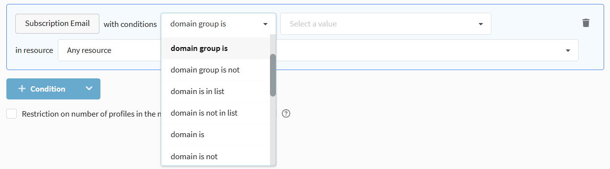 • Domain is / Domain is not / Domain contains — search by the domain of subscribers' email addresses or part of it (bk.ru, list.ru, ya.ru, organizational domains).