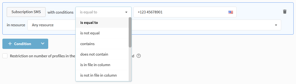 Segmentation by data contained in the SMS subscription. Selections by exact or partial match are available: Is equal to / Is not equal to, Contains / Does not contain, as well as checks in lists and external sources.