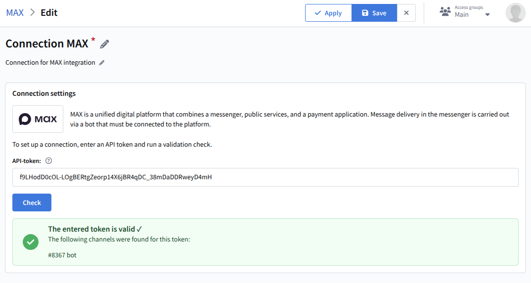 A connection to the MAX messenger is required to integrate the platform with MAX for further use as communication channels — MAX Bot and MAX Group.