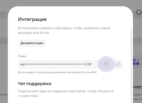 To create a connection, you will need your bot's API token in MAX. You can find the token in the Chatbots section on the MAX for Partners platform. In this section, go to Integration — Get token. The token will appear in the corresponding field: