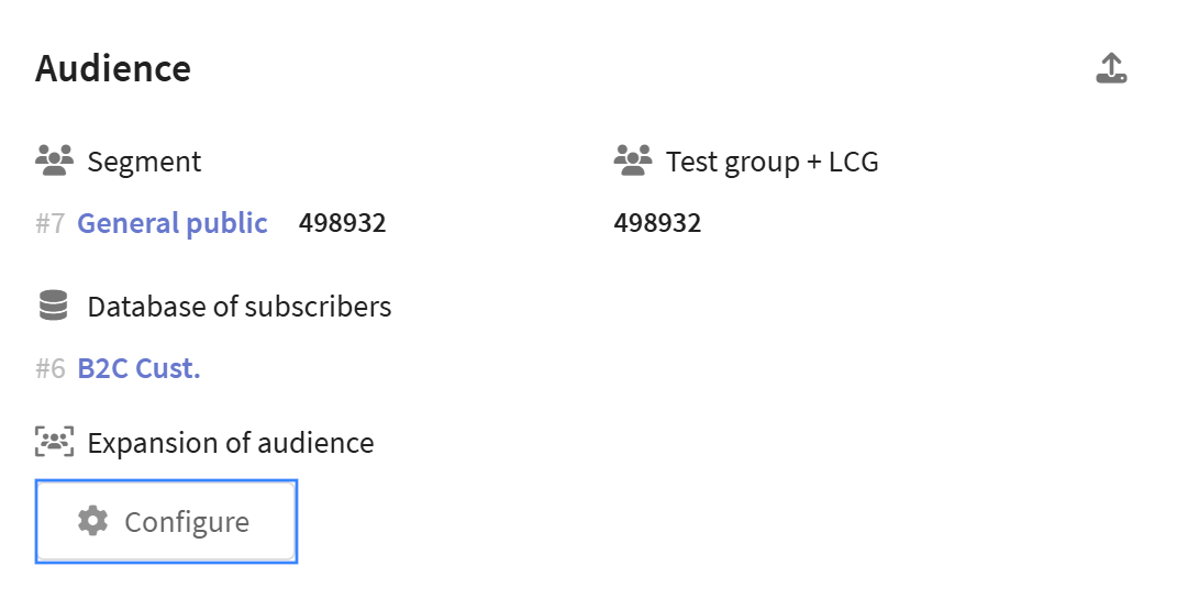 For example, a campaign targets the "Loyal customers" segment, but inside it you create a mailing aimed at the "New registrations" segment. Without audience expansion, these users will not receive the message because they are not part of the campaign audience. But if audience expansion is enabled for this mailing, the system will automatically add recipients from "New registrations" to the campaign and distribute them between the test group and the local control group, if LCG is enabled.