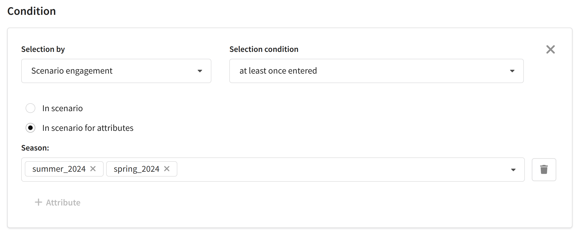 This condition will select profiles that have entered any scenario at least once where the attribute "Season" has the values "summer_2024" or "spring_2024":